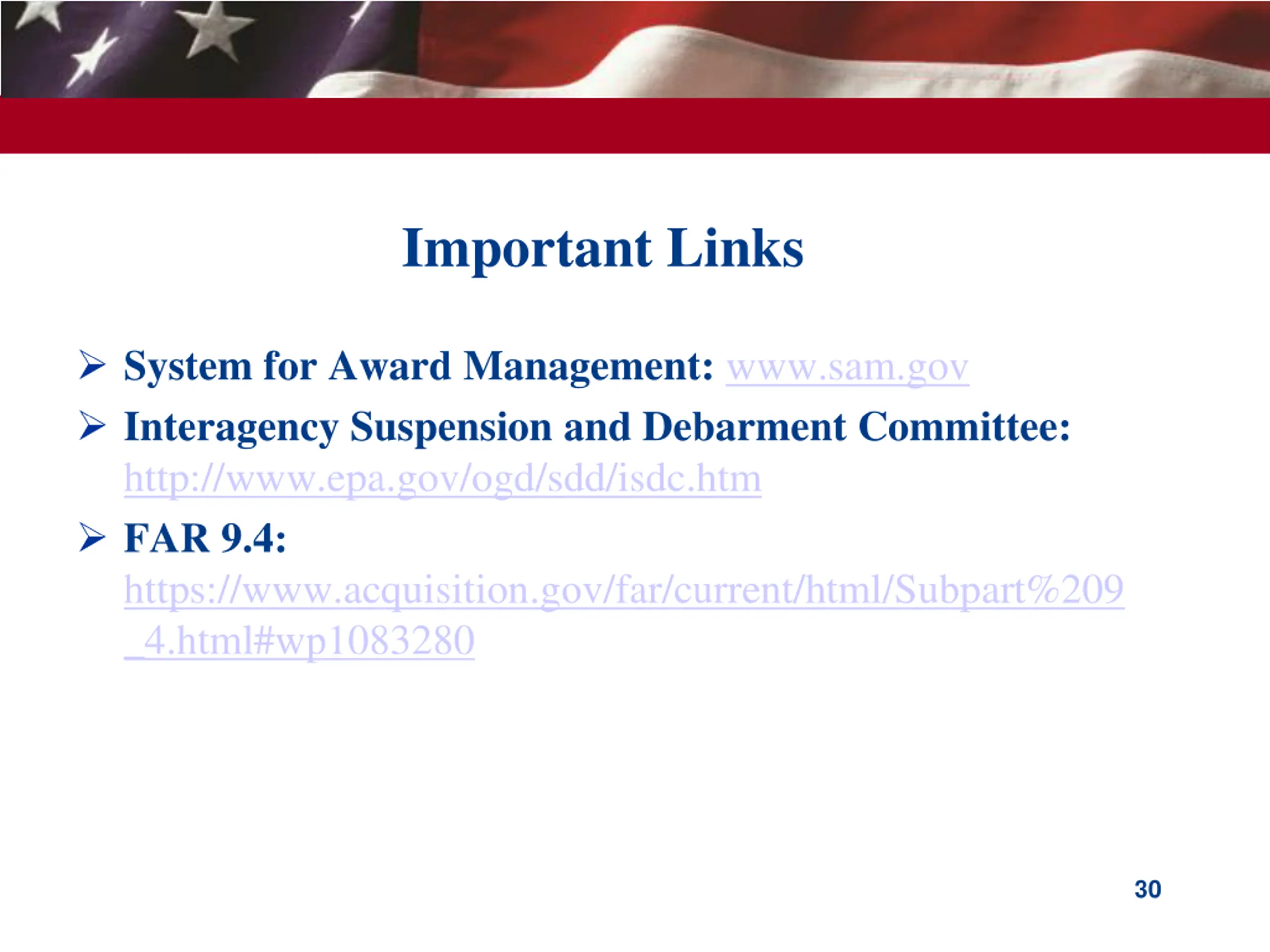 Important Links System for Award Management: www.sam.gov Interagency Suspension and Debarment Committee: http://www.epa.gov/ogd/sdd/isdc.htm FAR 9.4: https://www.acquisition.gov/far/current/html/Subpart%209 _4.html#wp1083280 30