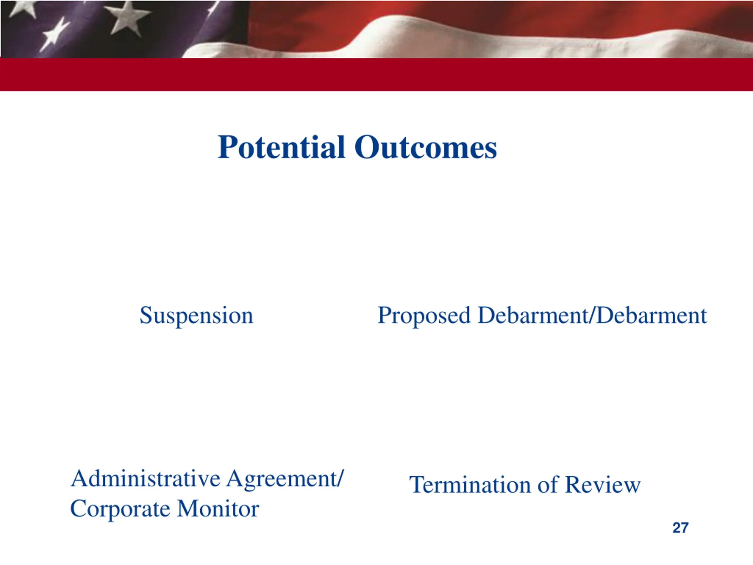 Potential Outcomes Suspension Proposed Debarment/Debarment Administrative Agreement/ Corporate Monitor Termination of Review 27