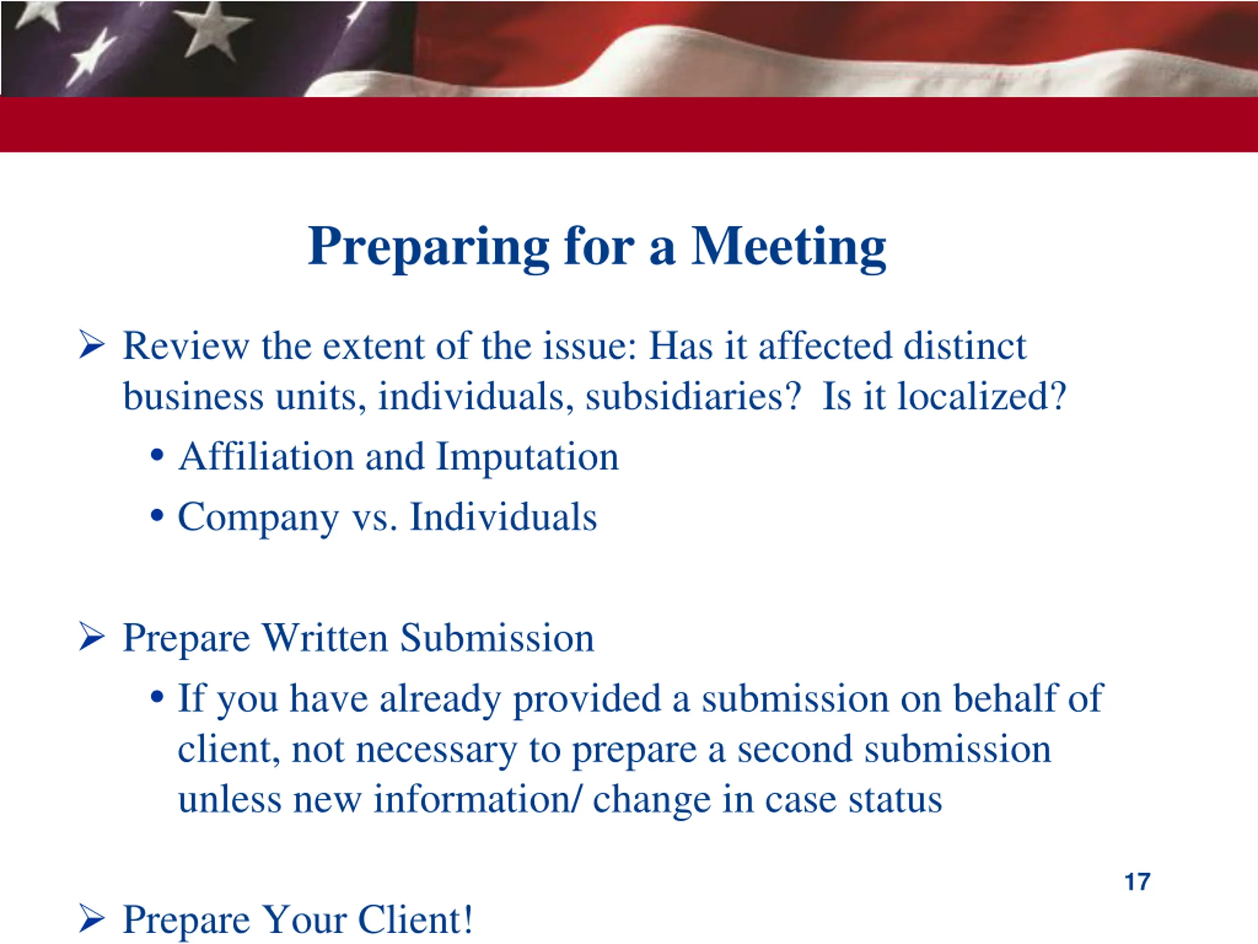 Preparing for a Meeting Review the extent of the issue: Has it affected distinct business units, individuals, subsidiaries? Is it localized? Affiliation and Imputation Company vs. Individuals Prepare Written Submission If you have already provided a submission on behalf of client, not necessary to prepare a second submission unless new information/ change in case status 17 Prepare Your Client!