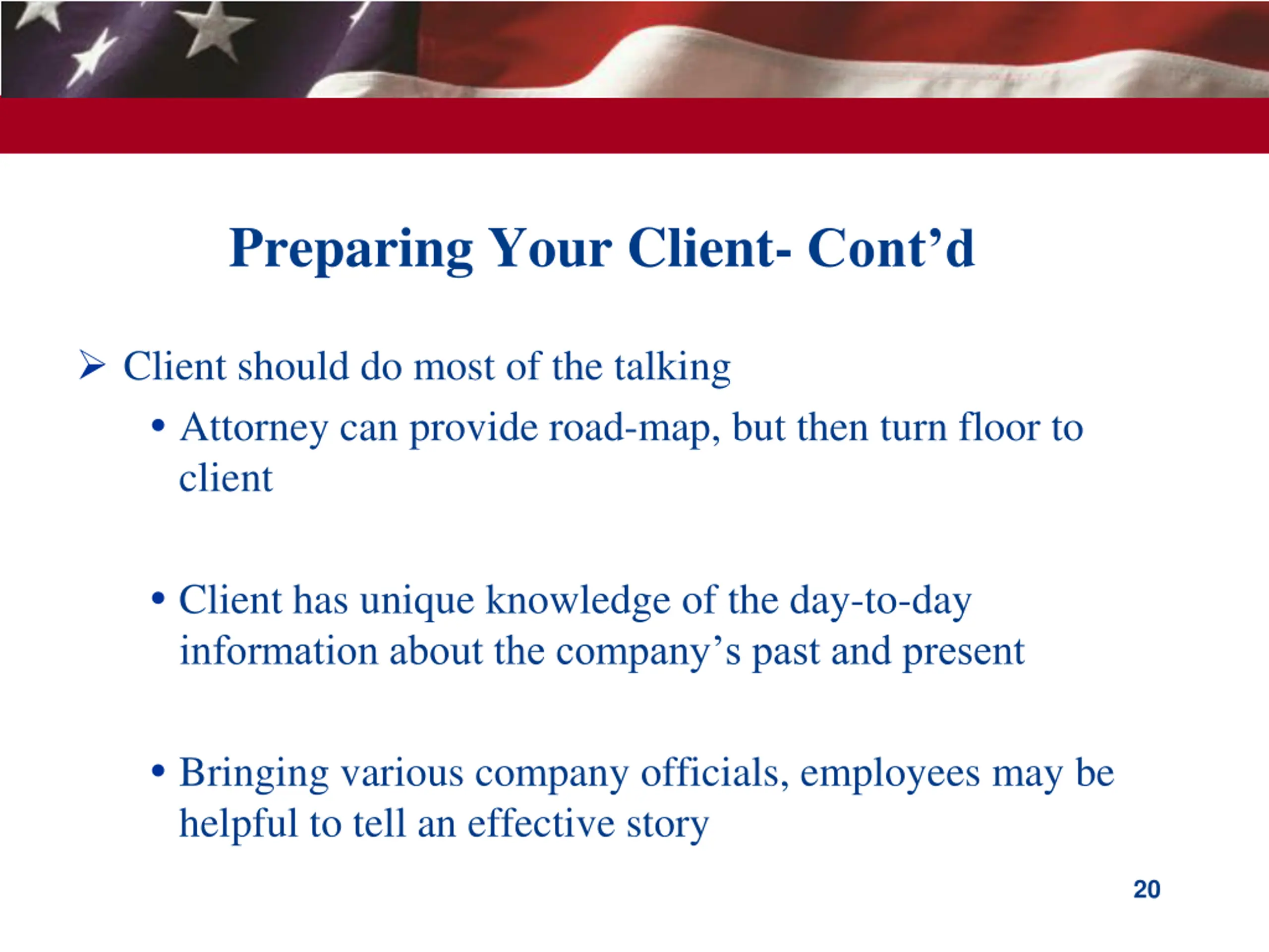 Preparing Your Client- Contd Client should do most of the talking Attorney can provide road-map, but then turn floor to client Client has unique knowledge of the day-to-day information about the company s past and present Bringing various company officials, employees may be helpful to tell an effective story 20