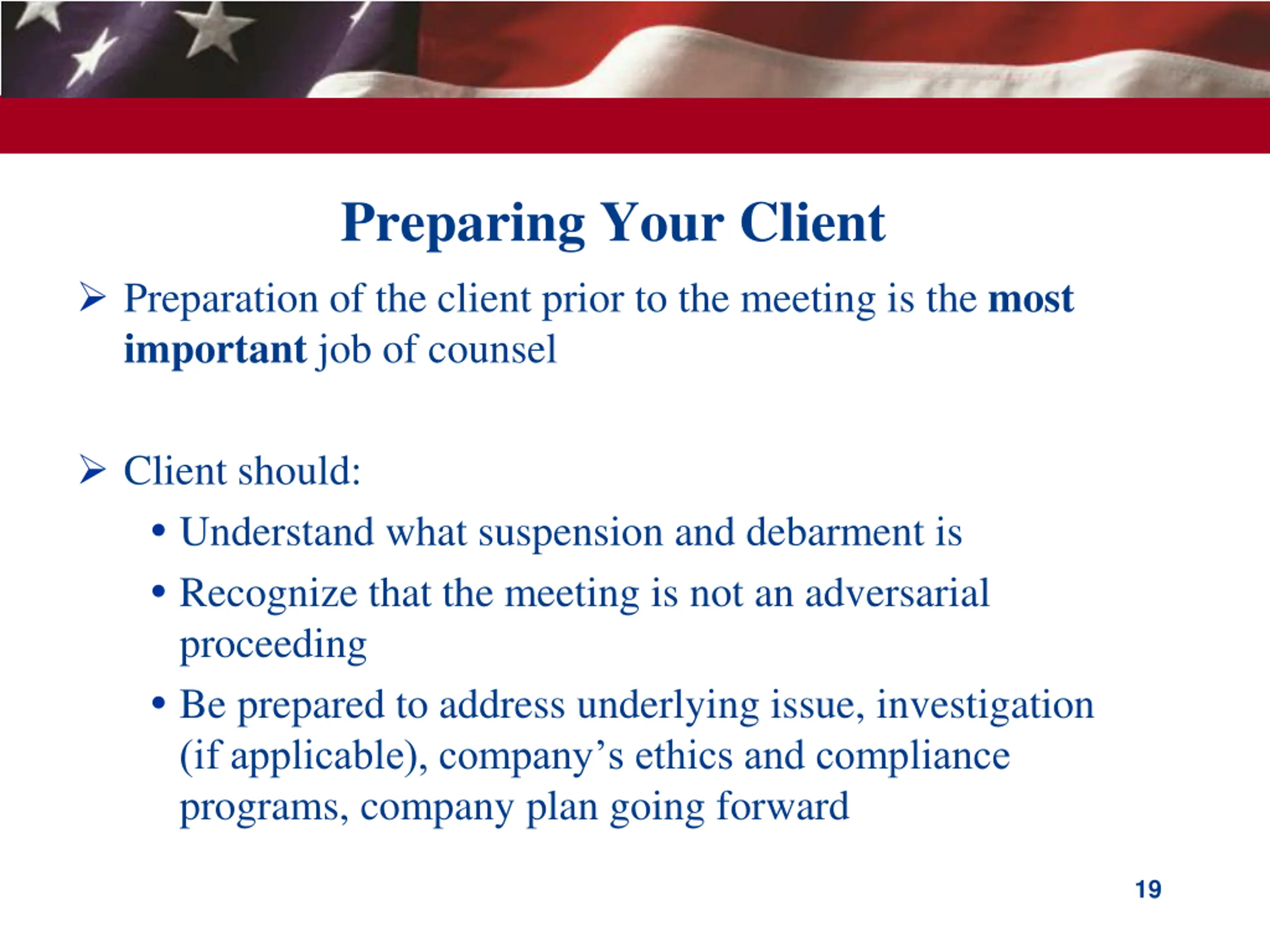 Preparing Your Client Preparation of the client prior to the meeting is the most important job of counsel Client should: Understand what suspension and debarment is Recognize that the meeting is not an adversarial proceeding Be prepared to address underlying issue, investigation (if applicable), company s ethics and compliance programs, company plan going forward 19
