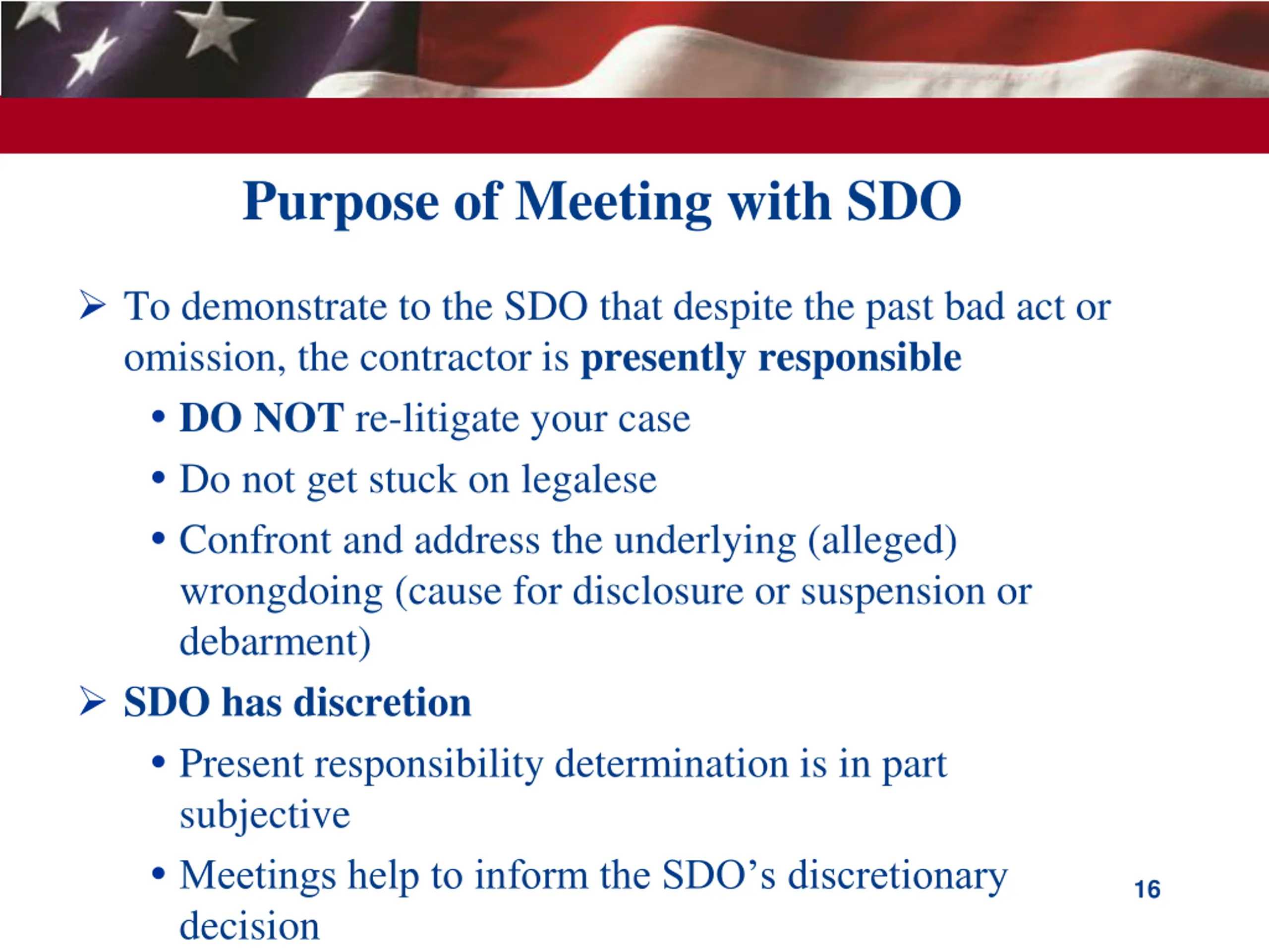 Considerations When Appearing Before an SDO Understand the process and what to expect, including the requests the SDO may make Use the right tone with the SDO - candor and transparency are critical Anticipate the agency s perspective and specific concerns and be prepared to address them Ensure written submissions address all the issues raised by the non-compliance event The SDO expects the contractor to lead the meeting and to control the agenda so be prepared 15