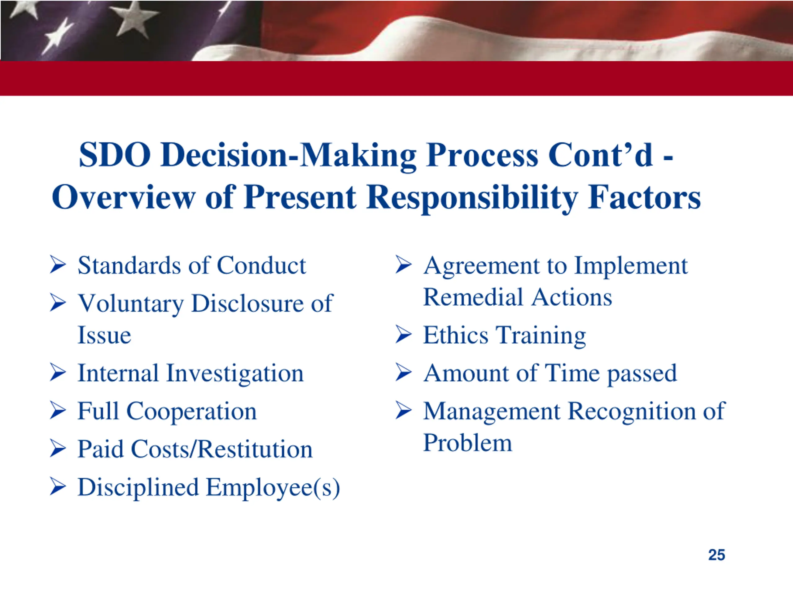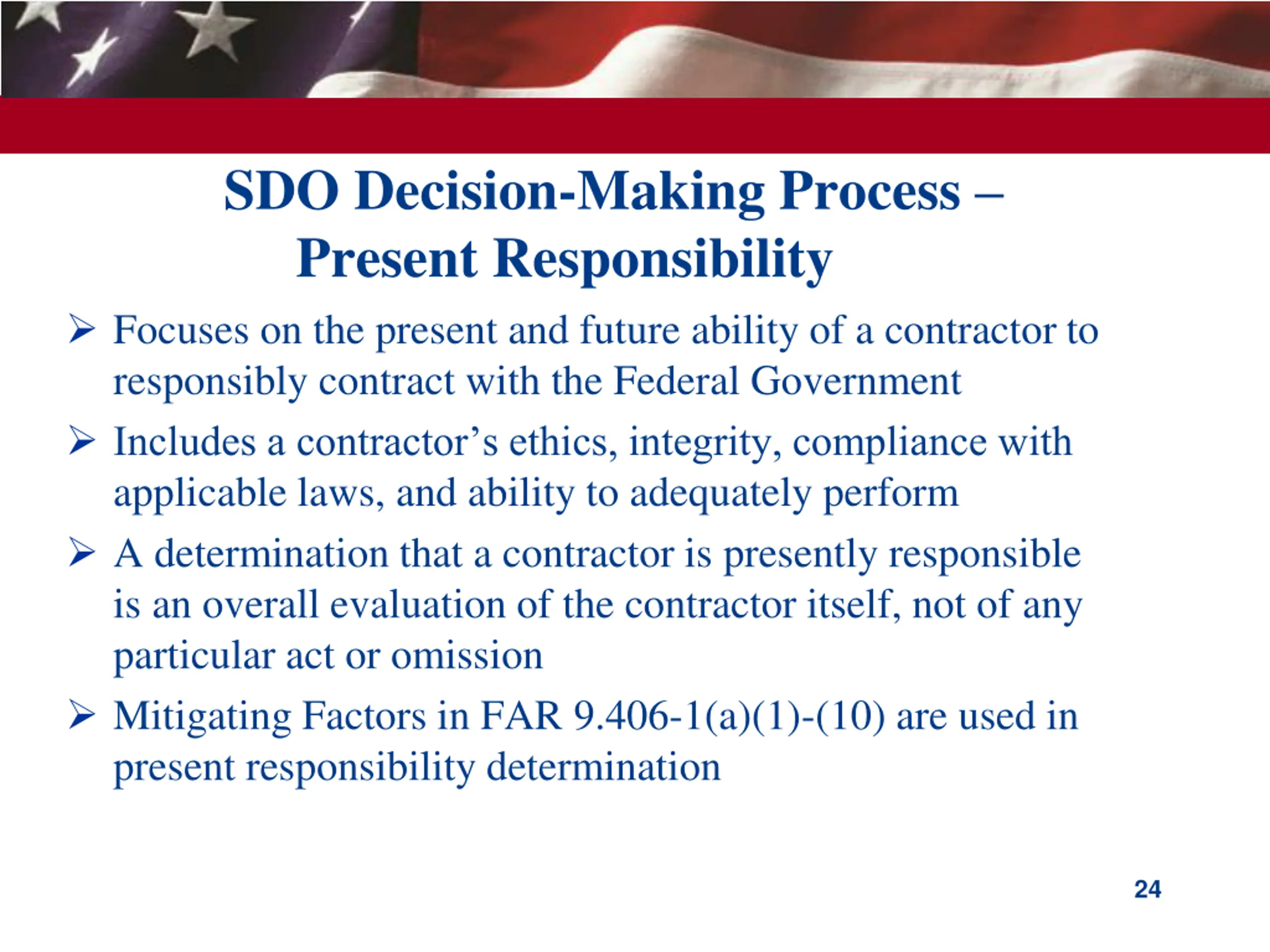 SDO Decision-Making Process Present Responsibility Focuses on the present and future ability of a contractor to responsibly contract with the Federal Government Includes a contractor s ethics, integrity, compliance with applicable laws, and ability to adequately perform A determination that a contractor is presently responsible is an overall evaluation of the contractor itself, not of any particular act or omission Mitigating Factors in FAR 9.406-1(a)(1)-(10) are used in present responsibility determination 24