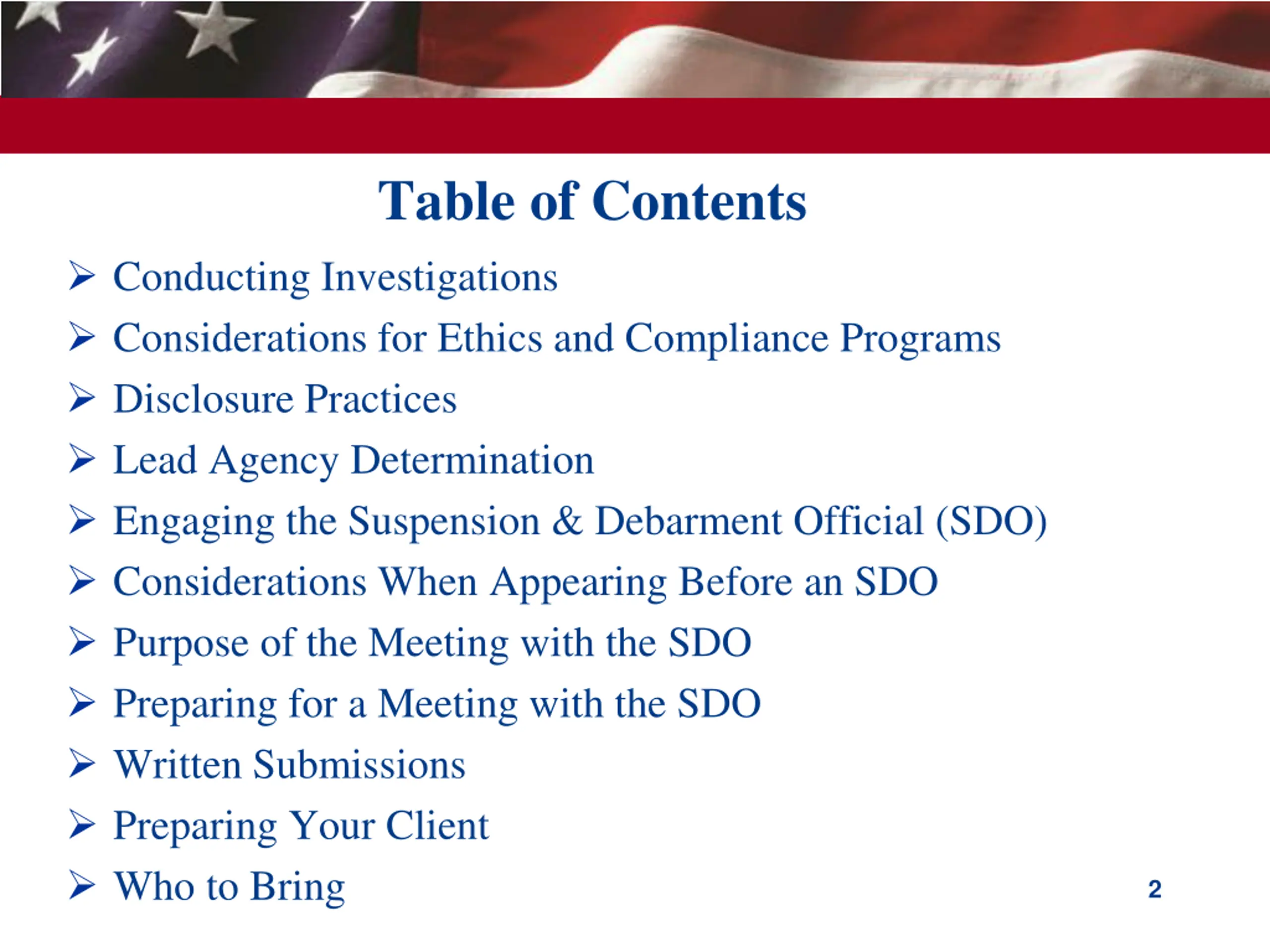 Table of Contents Conducting Investigations Considerations for Ethics and Compliance Programs Disclosure Practices Lead Agency Determination Engaging the Suspension & Debarment Official (SDO) Considerations When Appearing Before an SDO Purpose of the Meeting with the SDO Preparing for a Meeting with the SDO Written Submissions Preparing Your Client Who to Bring 2