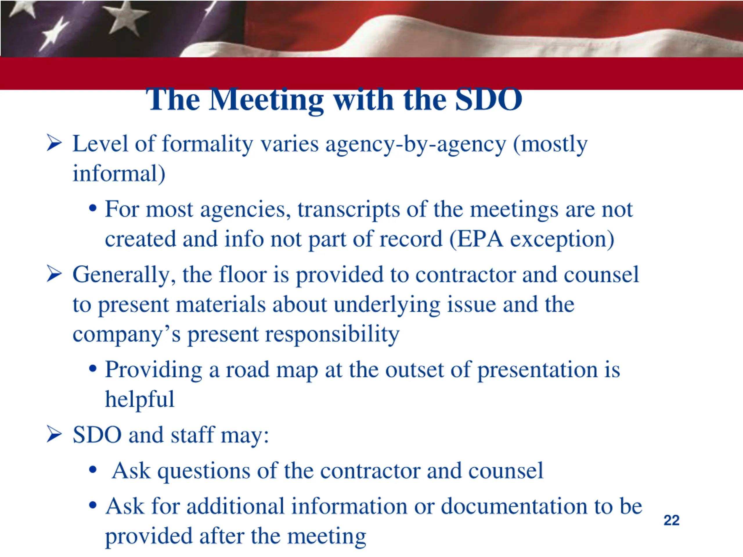 The Meeting with the SDO Level of formality varies agency-by-agency (mostly informal) For most agencies, transcripts of the meetings are not created and info not part of record (EPA exception) Generally, the floor is provided to contractor and counsel to present materials about underlying issue and the company s present responsibility Providing a road map at the outset of presentation is helpful SDO and staff may: Ask questions of the contractor and counsel Ask for additional information or documentation to be provided after the meeting 22