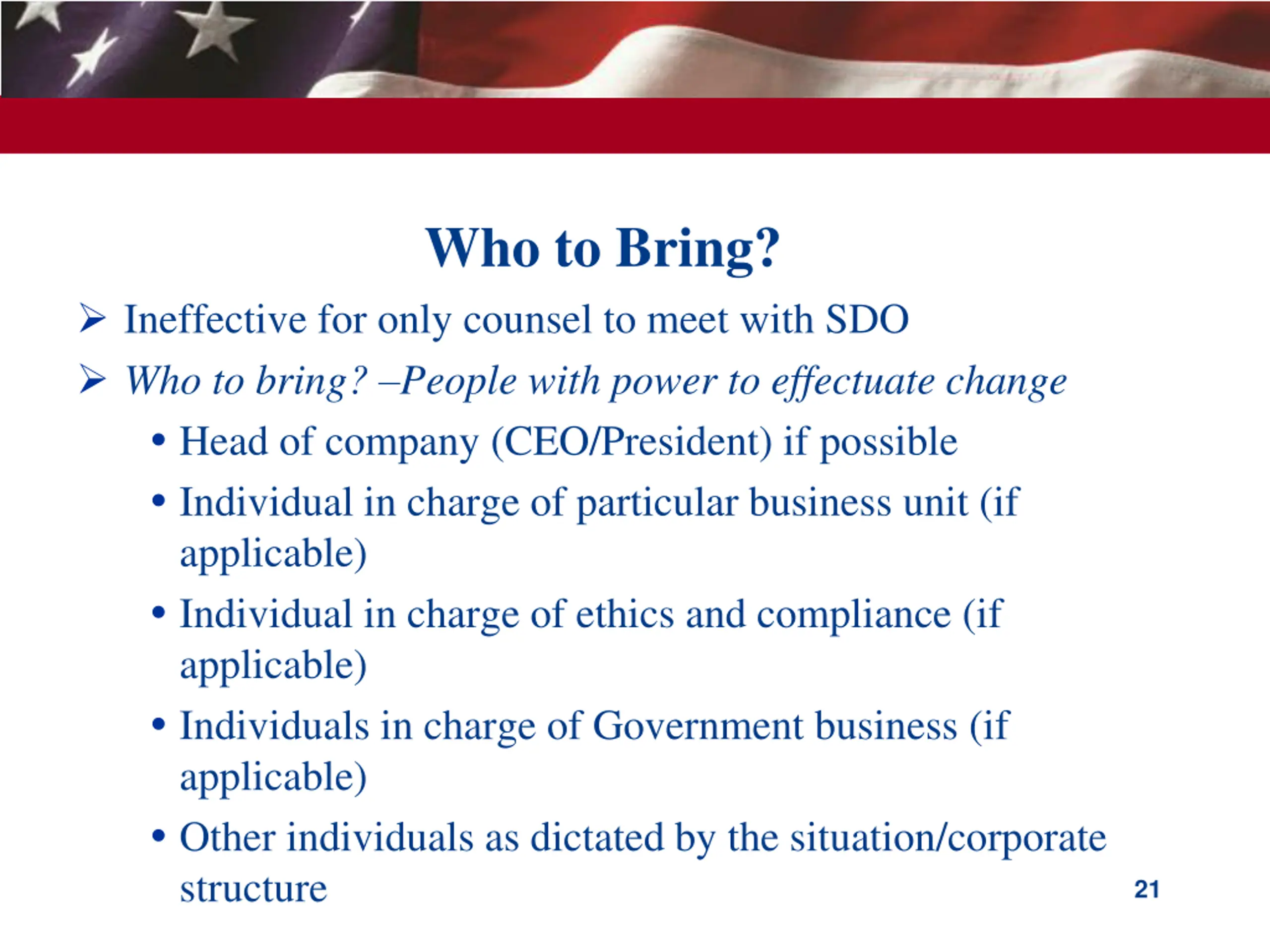 Who to Bring? Ineffective for only counsel to meet with SDO Who to bring? People with power to effectuate change Head of company (CEO/President) if possible Individual in charge of particular business unit (if applicable) Individual in charge of ethics and compliance (if applicable) Individuals in charge of Government business (if applicable) Other individuals as dictated by the situation/corporate structure 21