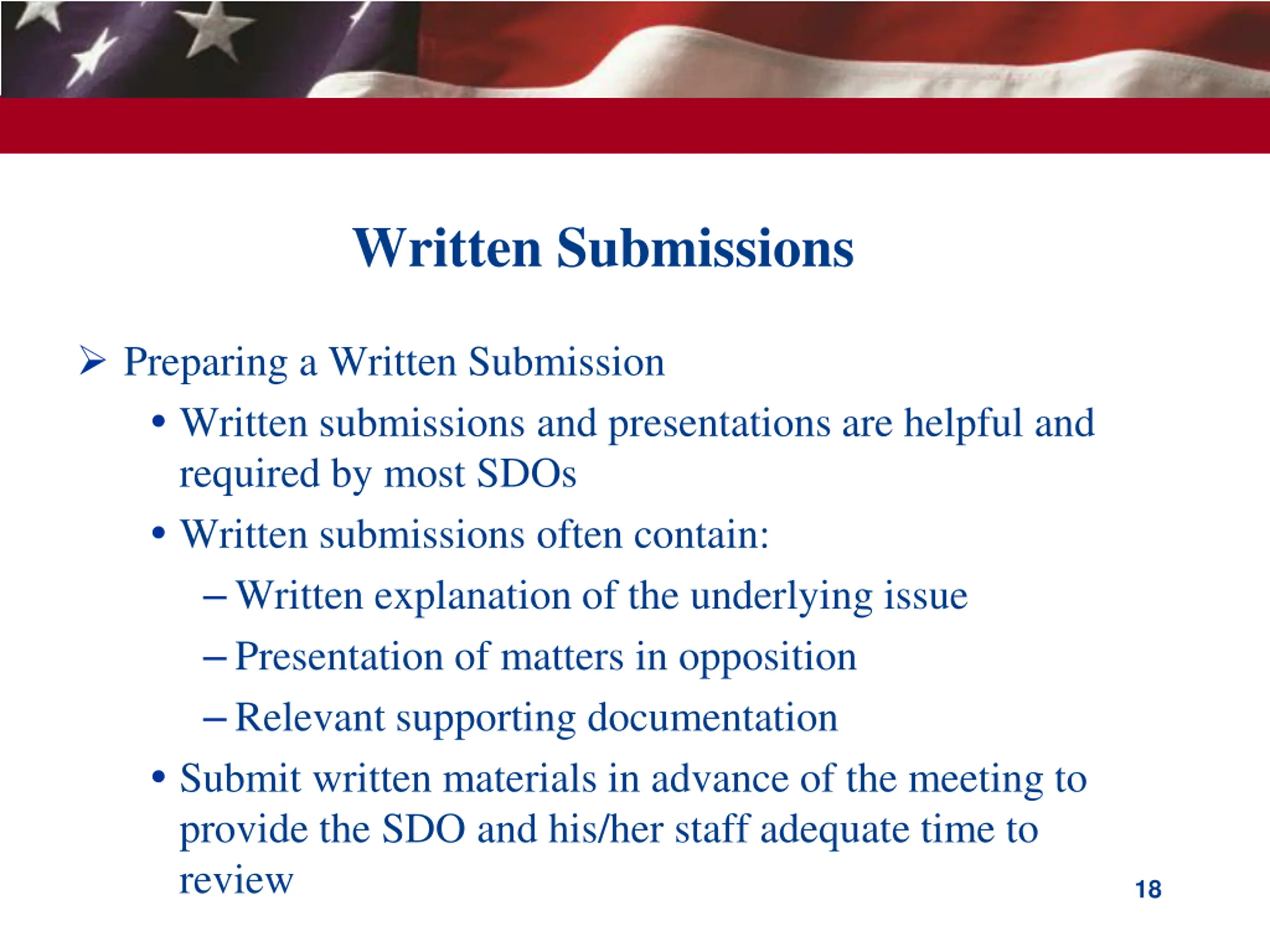 Written Submissions Preparing a Written Submission Written submissions and presentations are helpful and required by most SDOs Written submissions often contain: Written explanation of the underlying issue Presentation of matters in opposition Relevant supporting documentation Submit written materials in advance of the meeting to provide the SDO and his/her staff adequate time to review 18