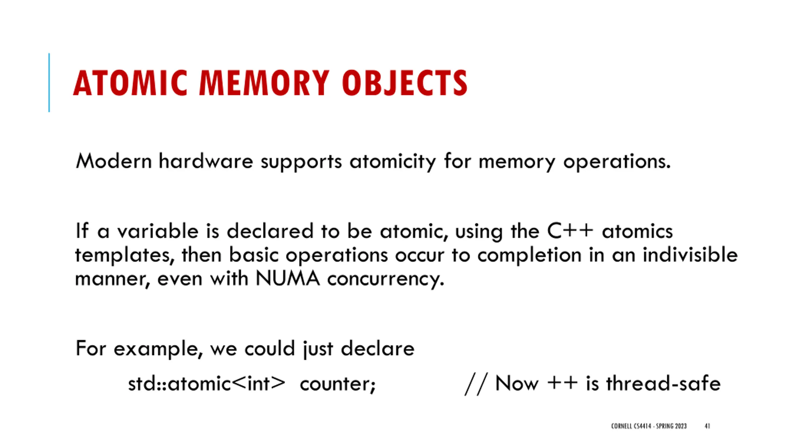 ATOMIC MEMORY OBJECTS Modern hardware supports atomicity for memory operations. If a variable is declared to be atomic, using the C++ atomics templates, then basic operations occur to completion in an indivisible manner, even with NUMA concurrency. For example, we could just declare std::atomic<int> counter; // Now ++ is thread-safe CORNELL CS4414 - SPRING 2023 41