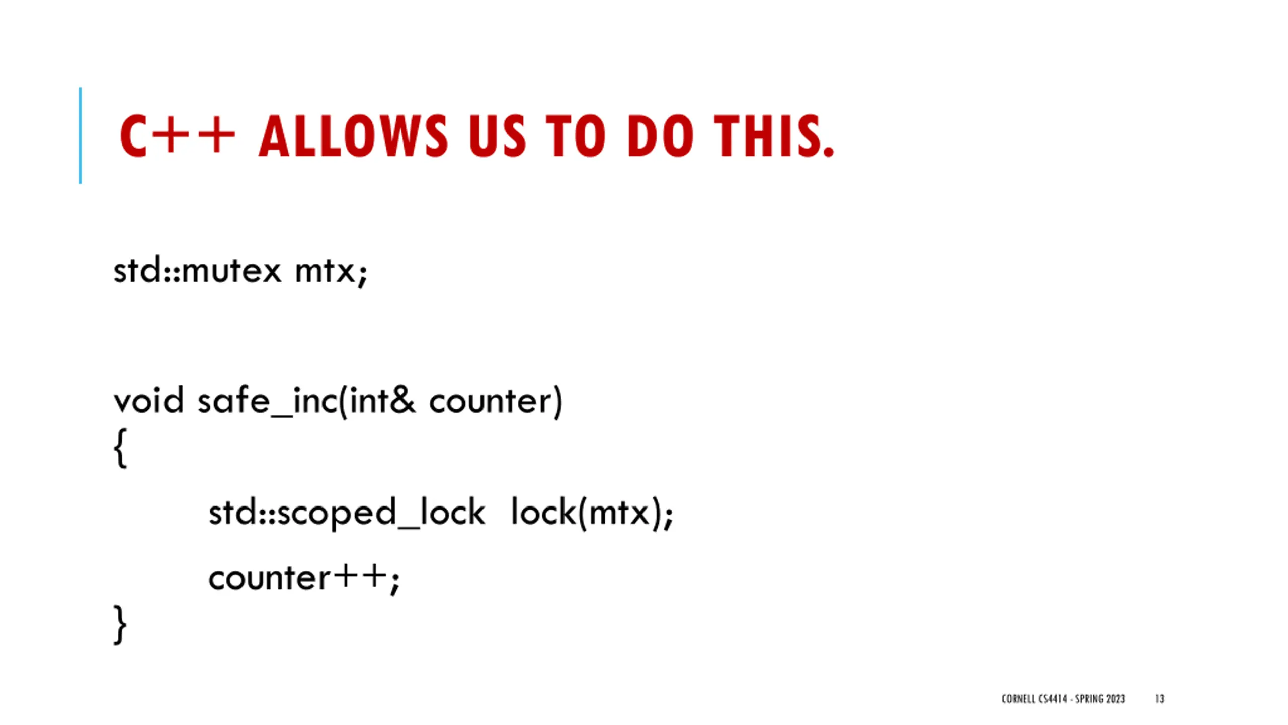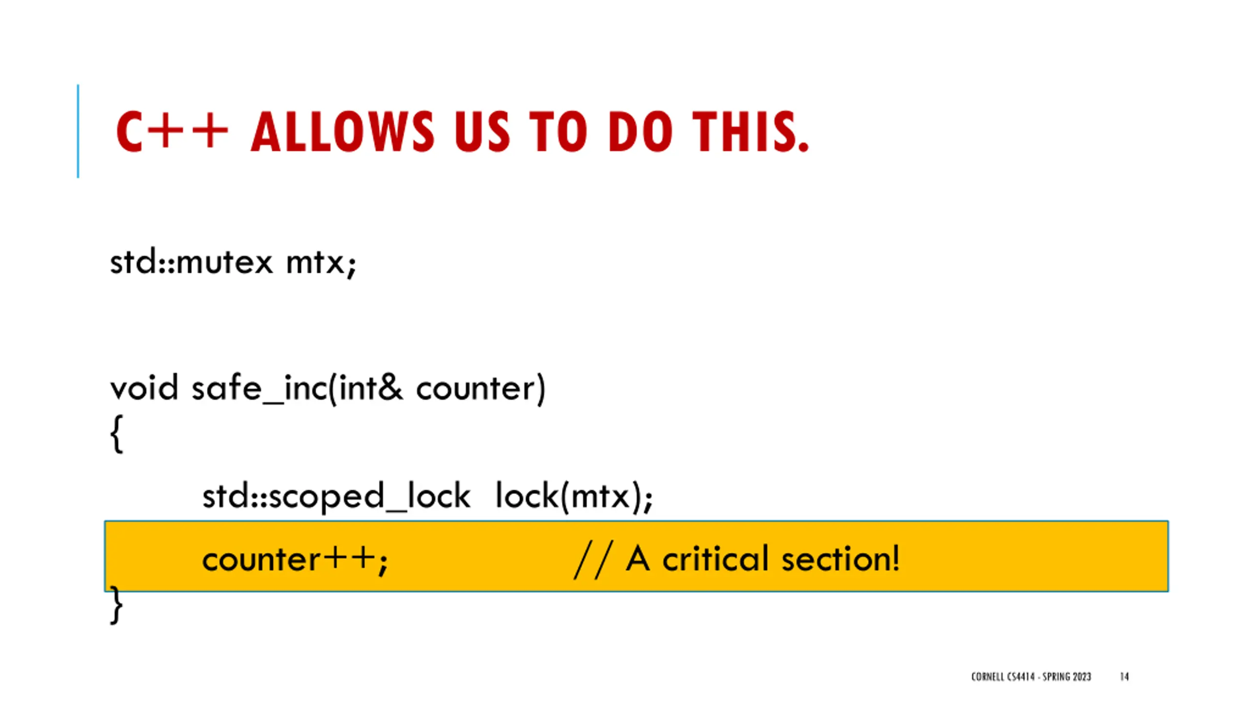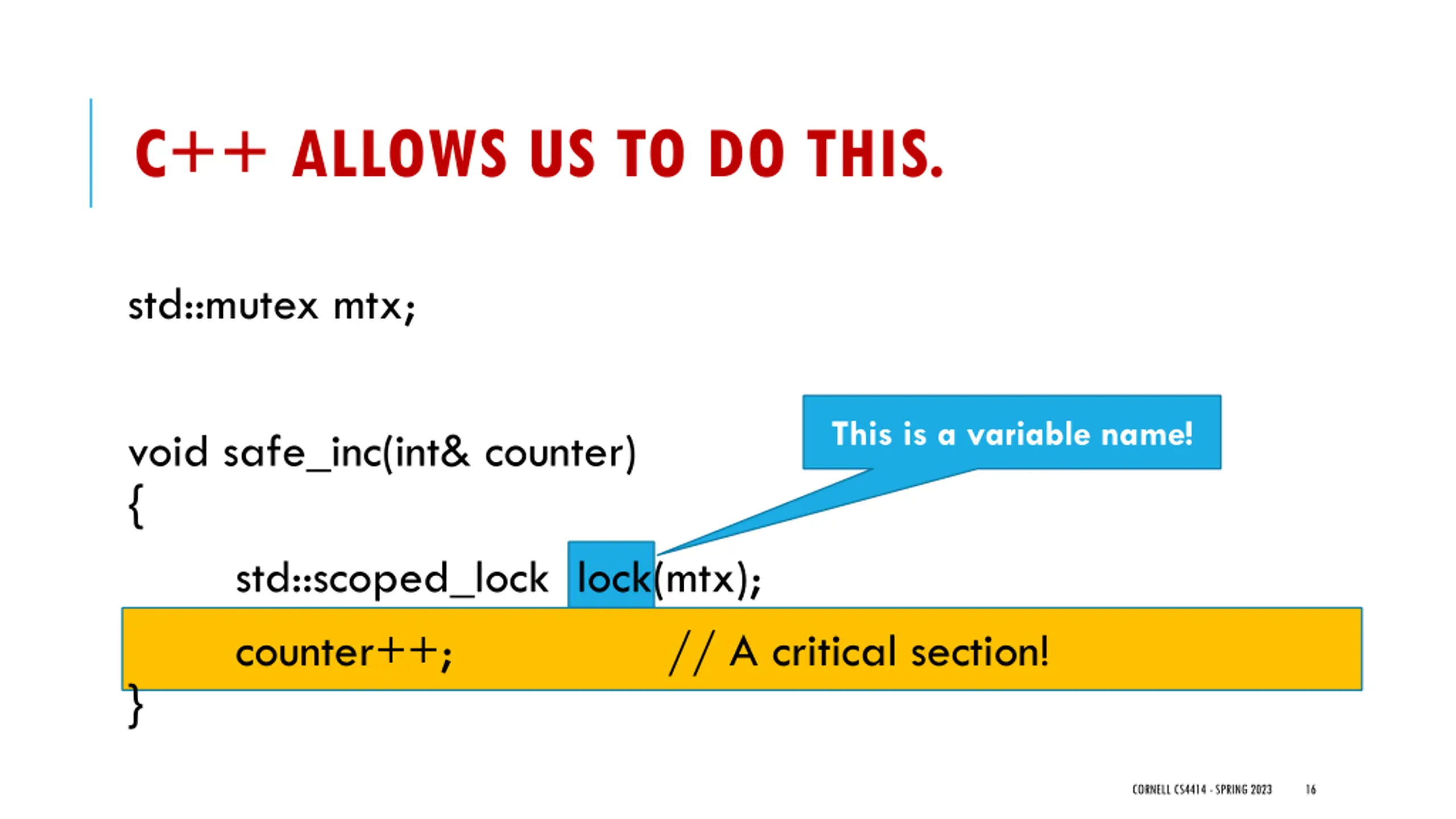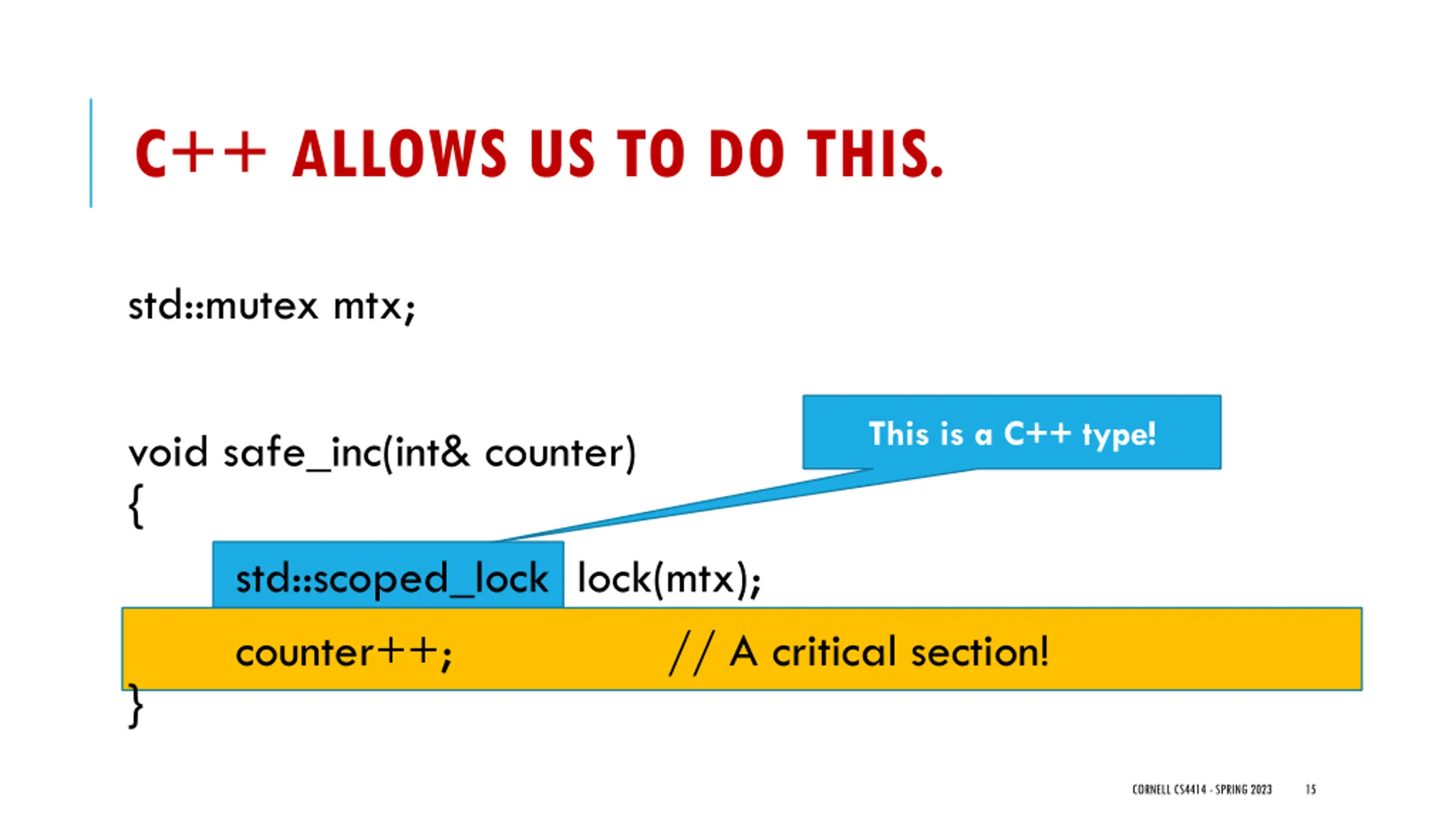 C++ ALLOWS US TO DO THIS. std::mutex mtx; This is a C++ type! void safe_inc(int& counter) { std::scoped_lock lock(mtx); counter++; // A critical section! } CORNELL CS4414 - SPRING 2023 15