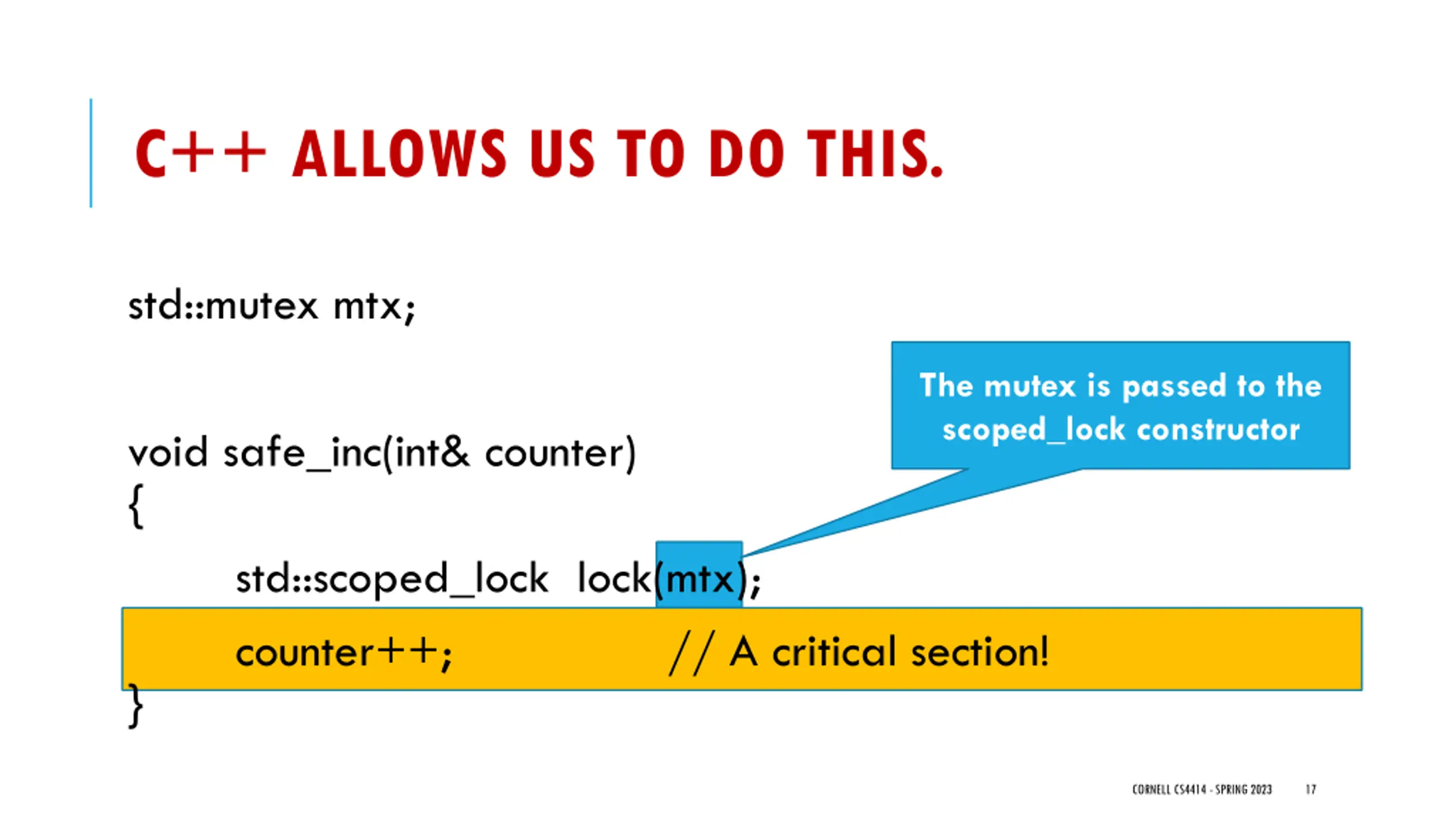 C++ ALLOWS US TO DO THIS. std::mutex mtx; The mutex is passed to the scoped_lock constructor void safe_inc(int& counter) { std::scoped_lock lock(mtx); counter++; // A critical section! } CORNELL CS4414 - SPRING 2023 17