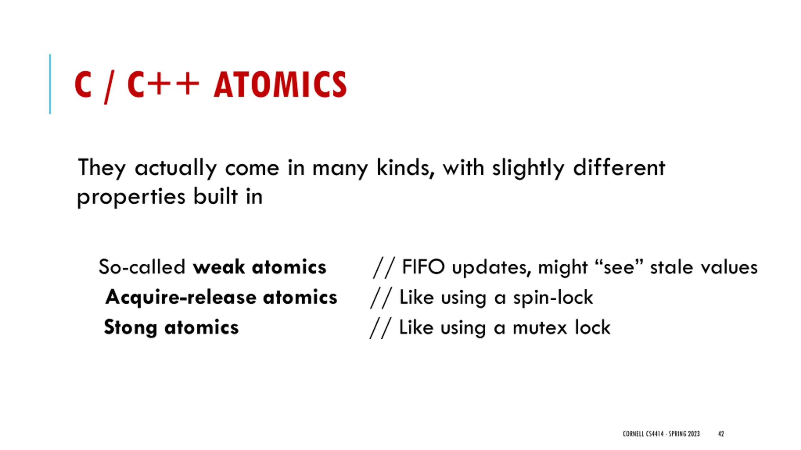 C / C++ ATOMICS They actually come in many kinds, with slightly different properties built in So-called weak atomics// FIFO updates, might see stale values Acquire-release atomics // Like using a spin-lock Stong atomics // Like using a mutex lock CORNELL CS4414 - SPRING 2023 42
