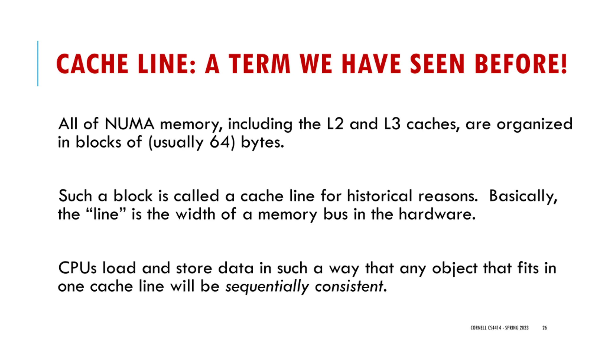 CACHE LINE: A TERM WE HAVE SEEN BEFORE! All of NUMA memory, including the L2 and L3 caches, are organized in blocks of (usually 64) bytes. Such a block is called a cache line for historical reasons. Basically, the line is the width of a memory bus in the hardware. CPUs load and store data in such a way that any object that fits in one cache line will be sequentially consistent. CORNELL CS4414 - SPRING 2023 26