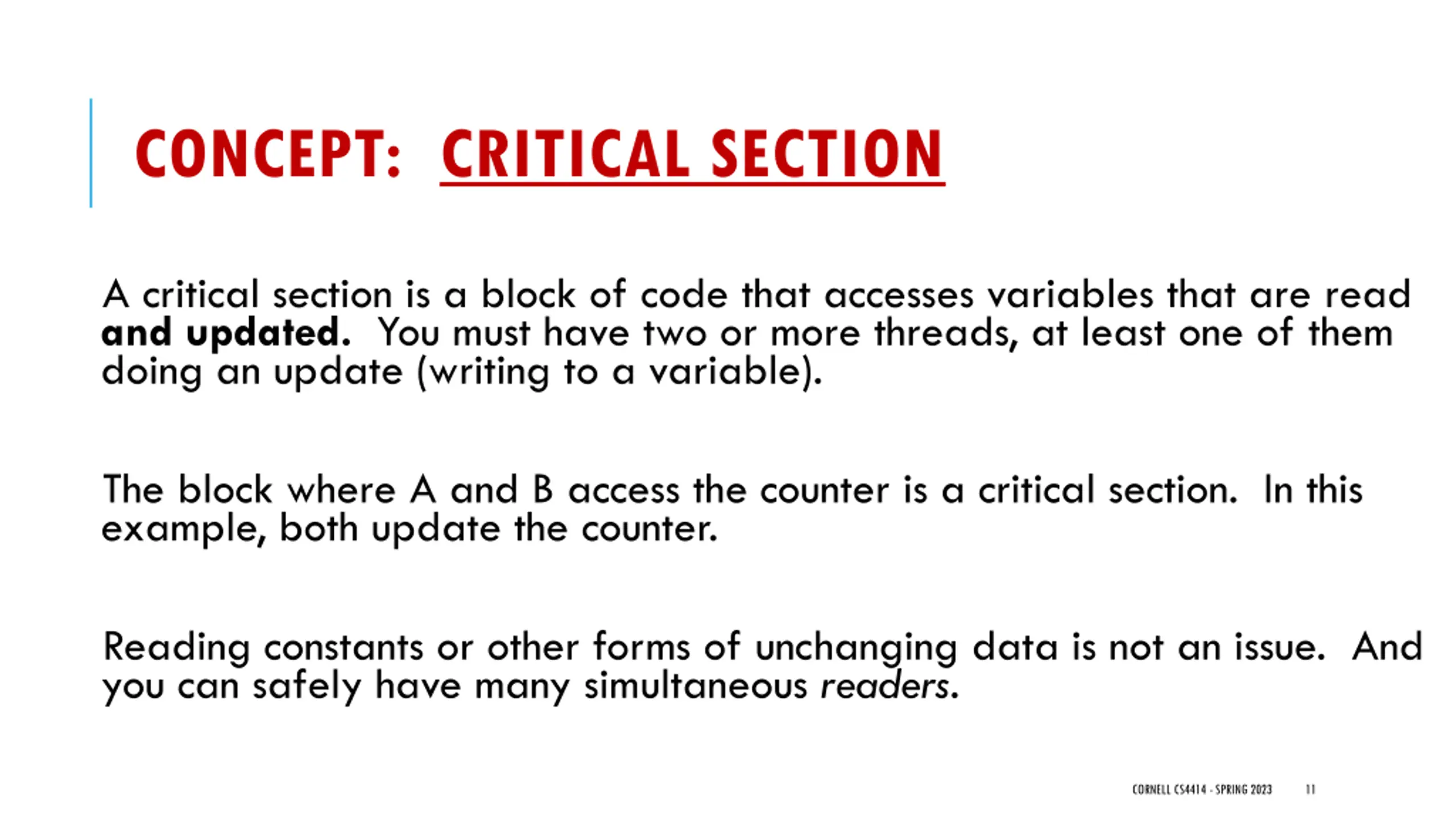CONCEPT: CRITICAL SECTION A critical section is a block of code that accesses variables that are read and updated. You must have two or more threads, at least one of them doing an update (writing to a variable). The block where A and B access the counter is a critical section. In this example, both update the counter. Reading constants or other forms of unchanging data is not an issue. And you can safely have many simultaneous readers. CORNELL CS4414 - SPRING 2023 11
