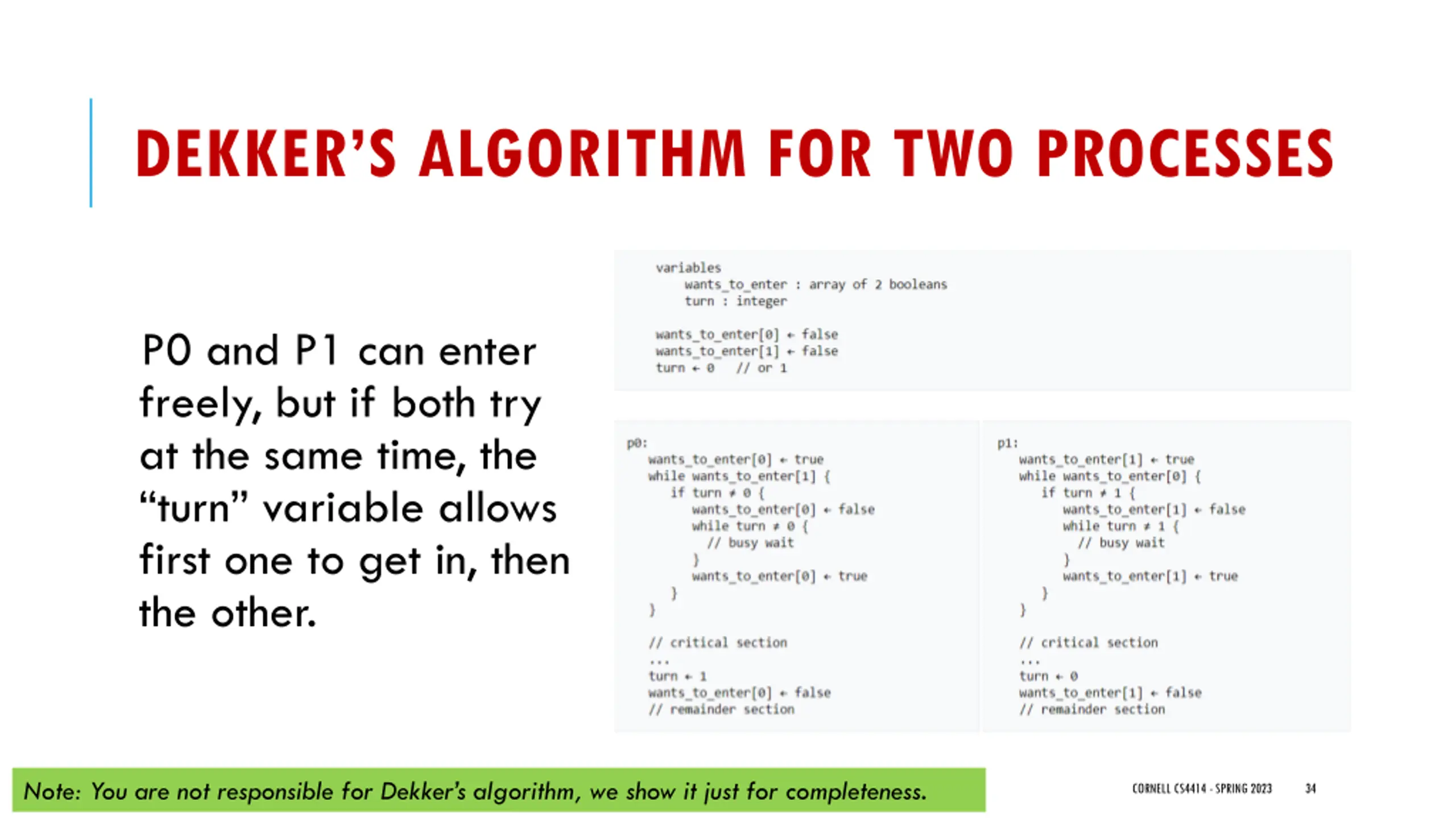 DEKKERS ALGORITHM FOR TWO PROCESSES P0 and P1 can enter freely, but if both try at the same time, the turn variable allows first one to get in, then the other. Note: You are not responsible for Dekker s algorithm, we show it just for completeness. CORNELL CS4414 - SPRING 2023 34
