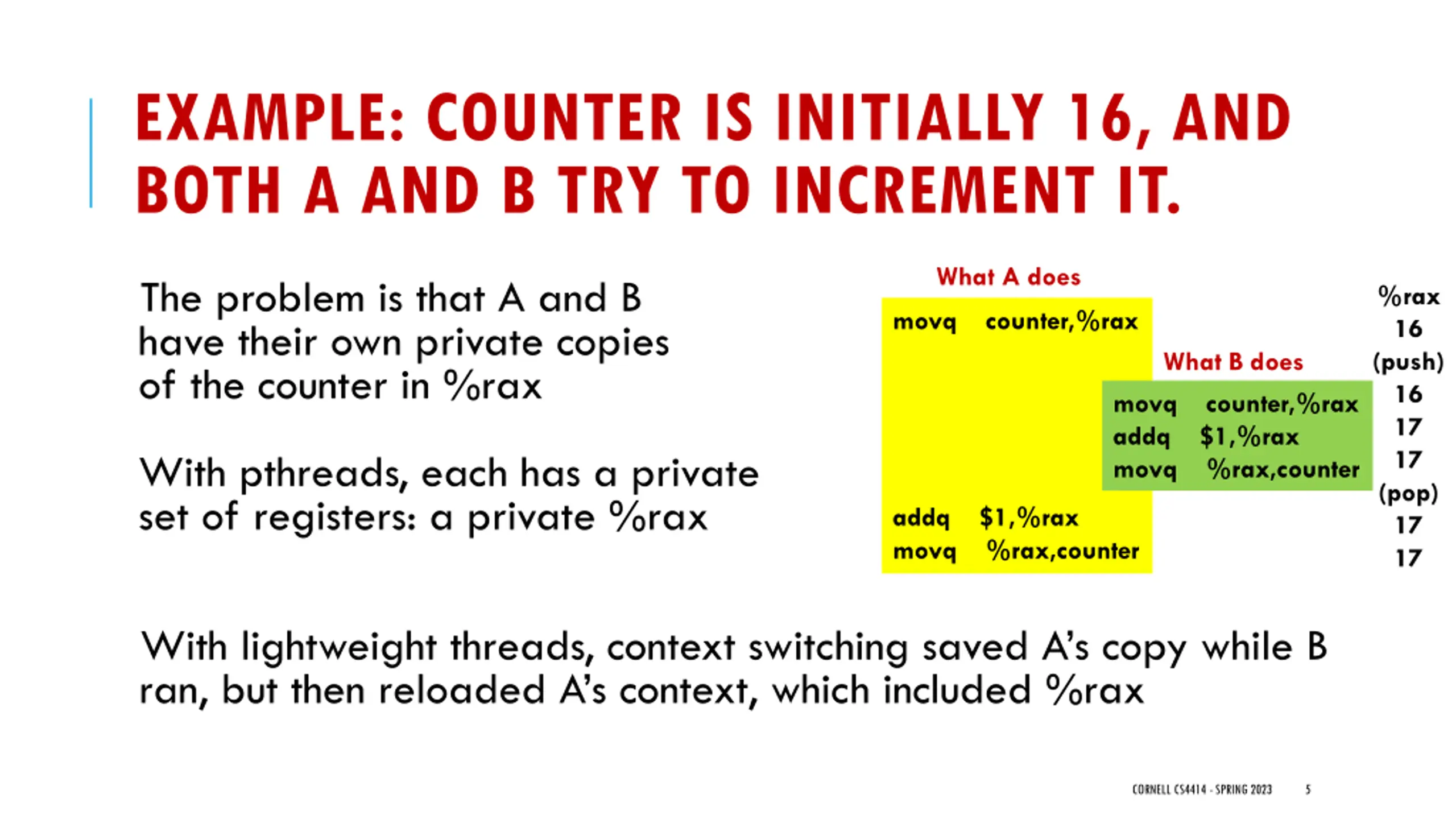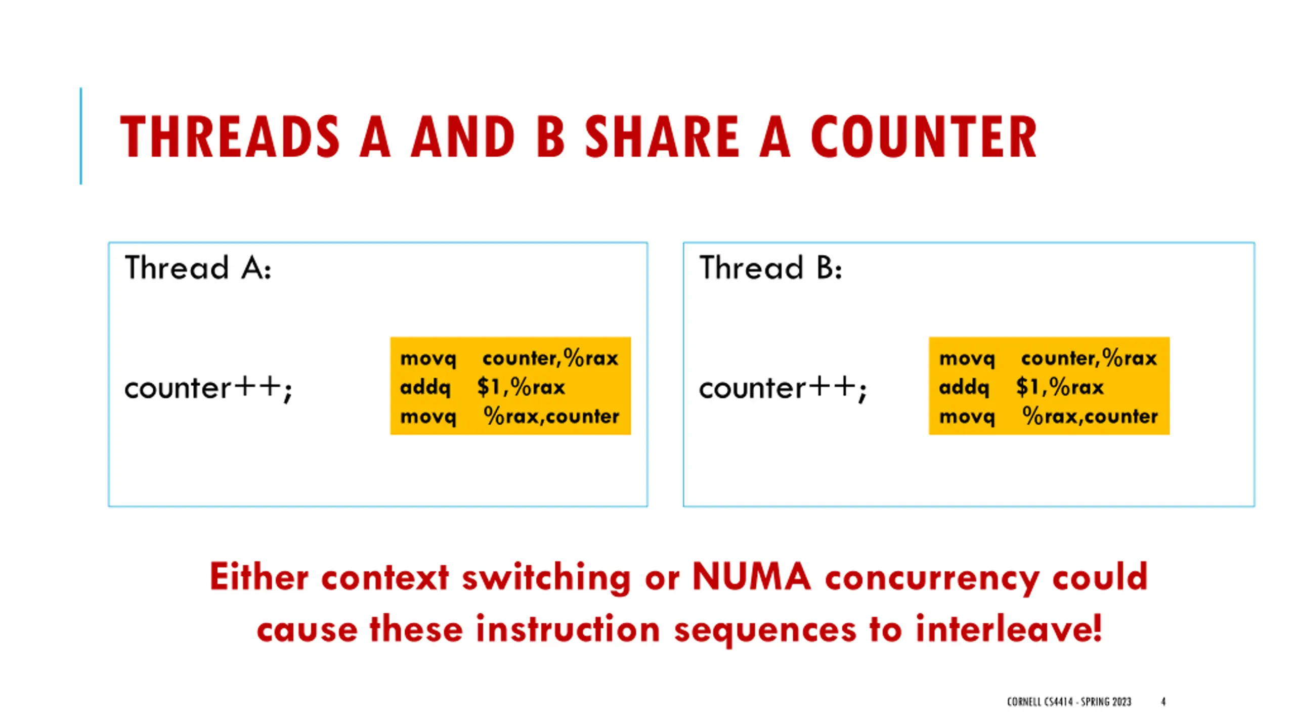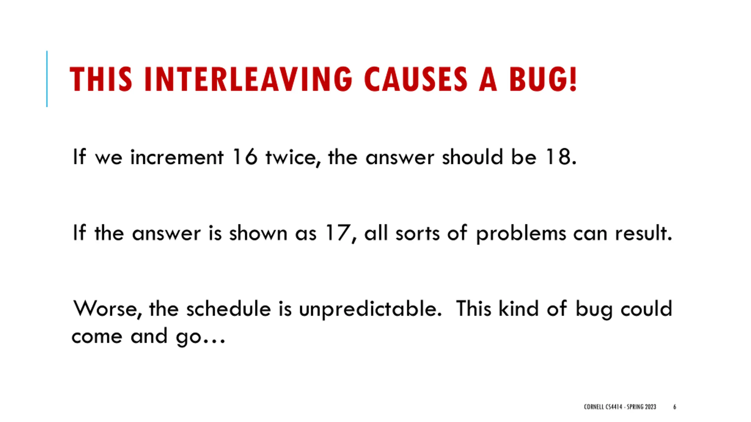 THIS INTERLEAVING CAUSES A BUG! If we increment 16 twice, the answer should be 18. If the answer is shown as 17, all sorts of problems can result. Worse, the schedule is unpredictable. This kind of bug could come and go CORNELL CS4414 - SPRING 2023 6