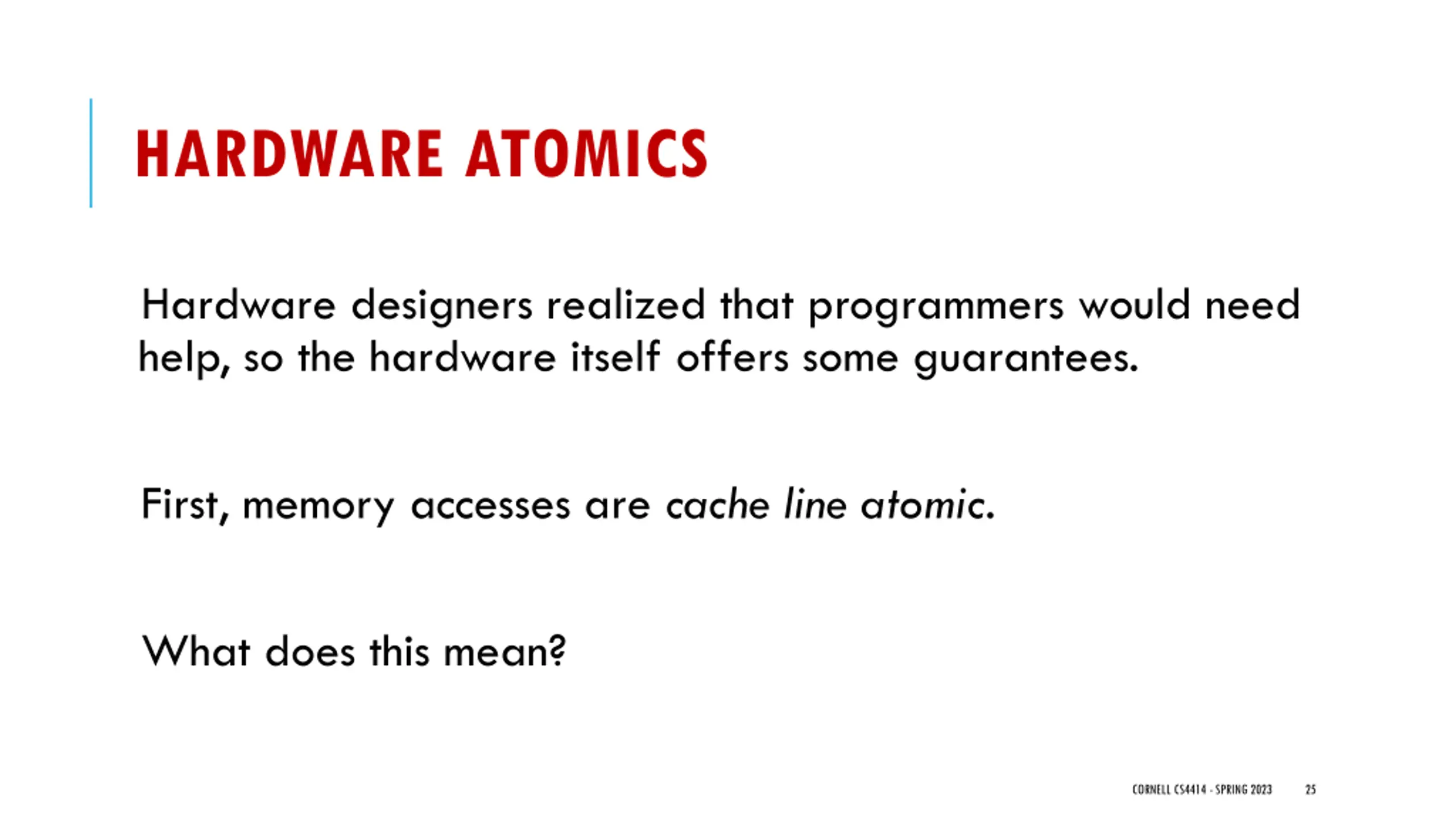 HARDWARE ATOMICS Hardware designers realized that programmers would need help, so the hardware itself offers some guarantees. First, memory accesses are cache line atomic. What does this mean? CORNELL CS4414 - SPRING 2023 25