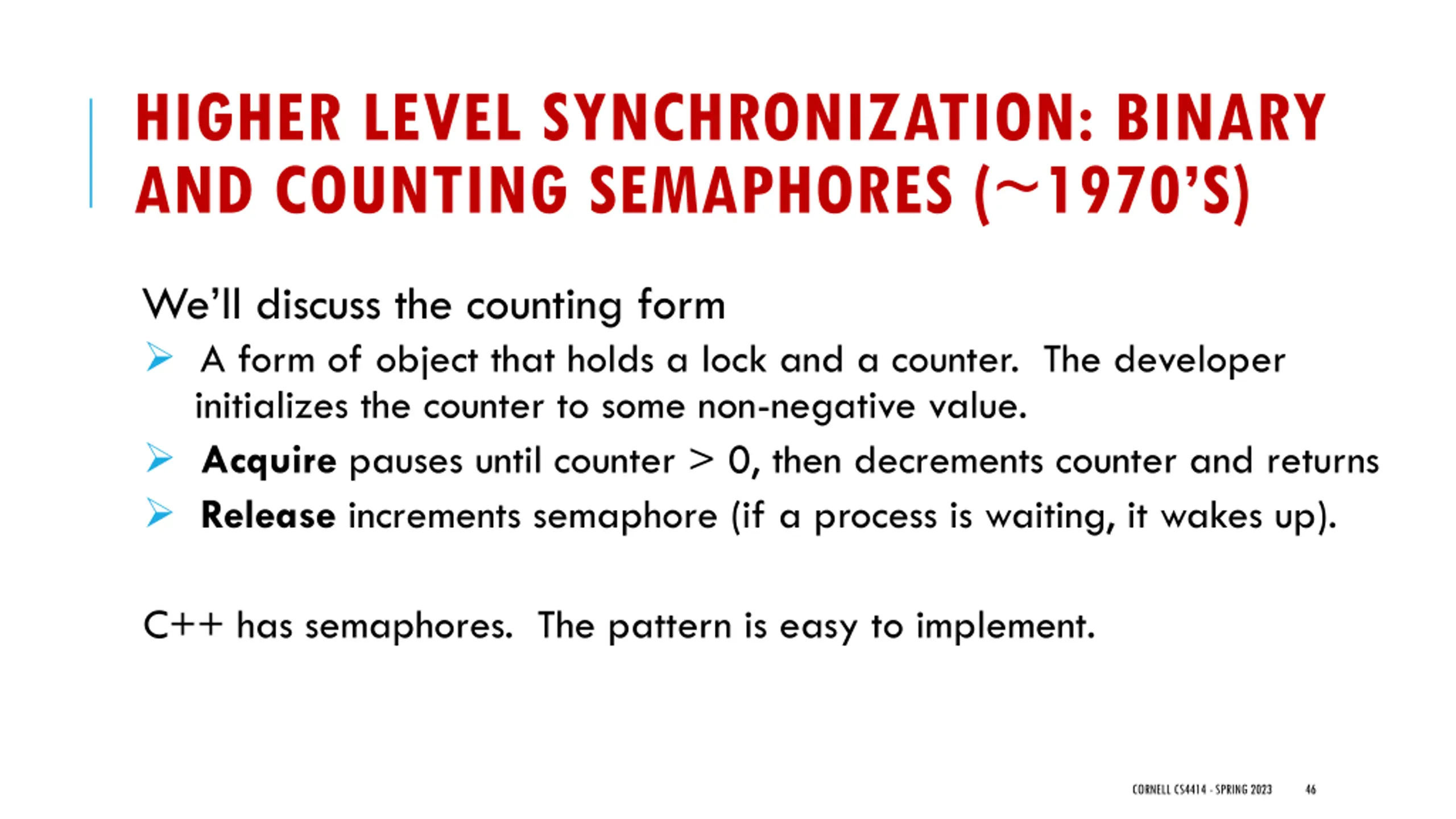HIGHER LEVEL SYNCHRONIZATION: BINARY AND COUNTING SEMAPHORES (~1970 S) We ll discuss the counting form A form of object that holds a lock and a counter. The developer initializes the counter to some non-negative value. Acquire pauses until counter > 0, then decrements counter and returns Release increments semaphore (if a process is waiting, it wakes up). C++ has semaphores. The pattern is easy to implement. CORNELL CS4414 - SPRING 2023 46