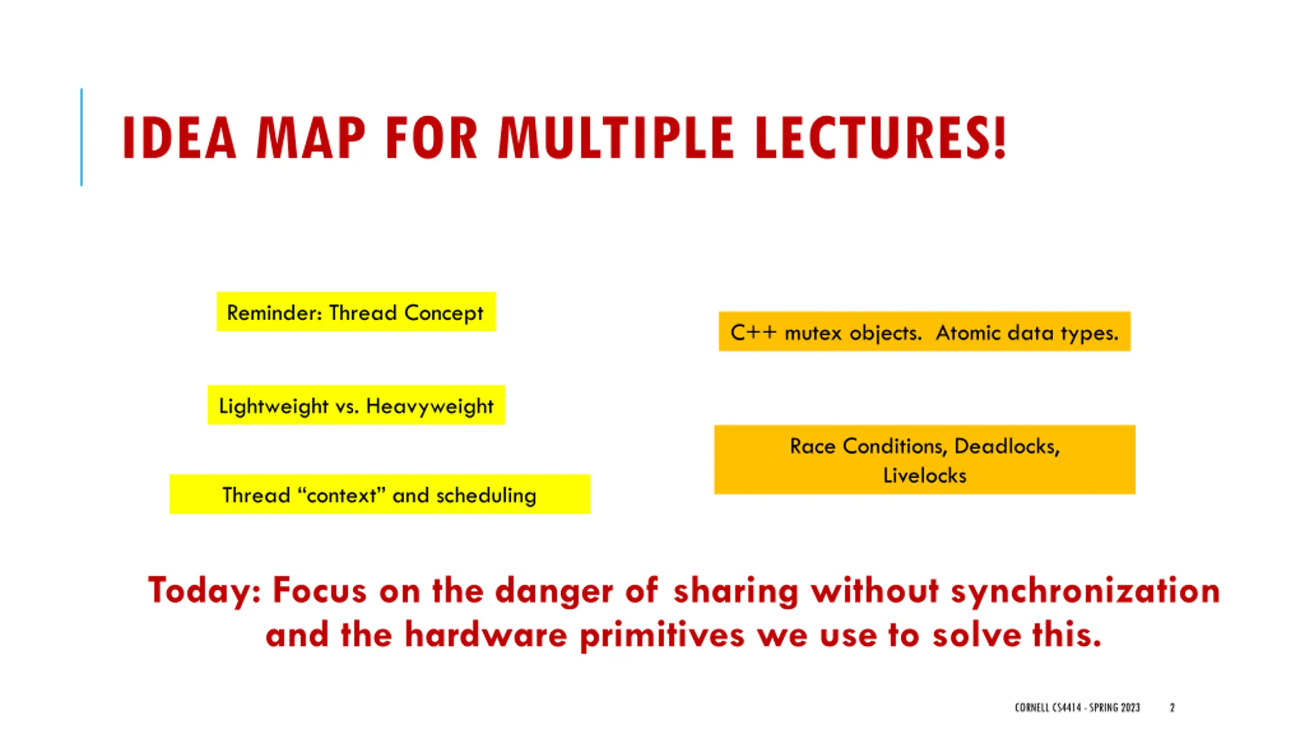IDEA MAP FOR MULTIPLE LECTURES! Reminder: Thread Concept C++ mutex objects. Atomic data types. Lightweight vs. Heavyweight Race Conditions, Deadlocks, Livelocks Thread context and scheduling Today: Focus on the danger of sharing without synchronization and the hardware primitives we use to solve this. CORNELL CS4414 - SPRING 2023 2