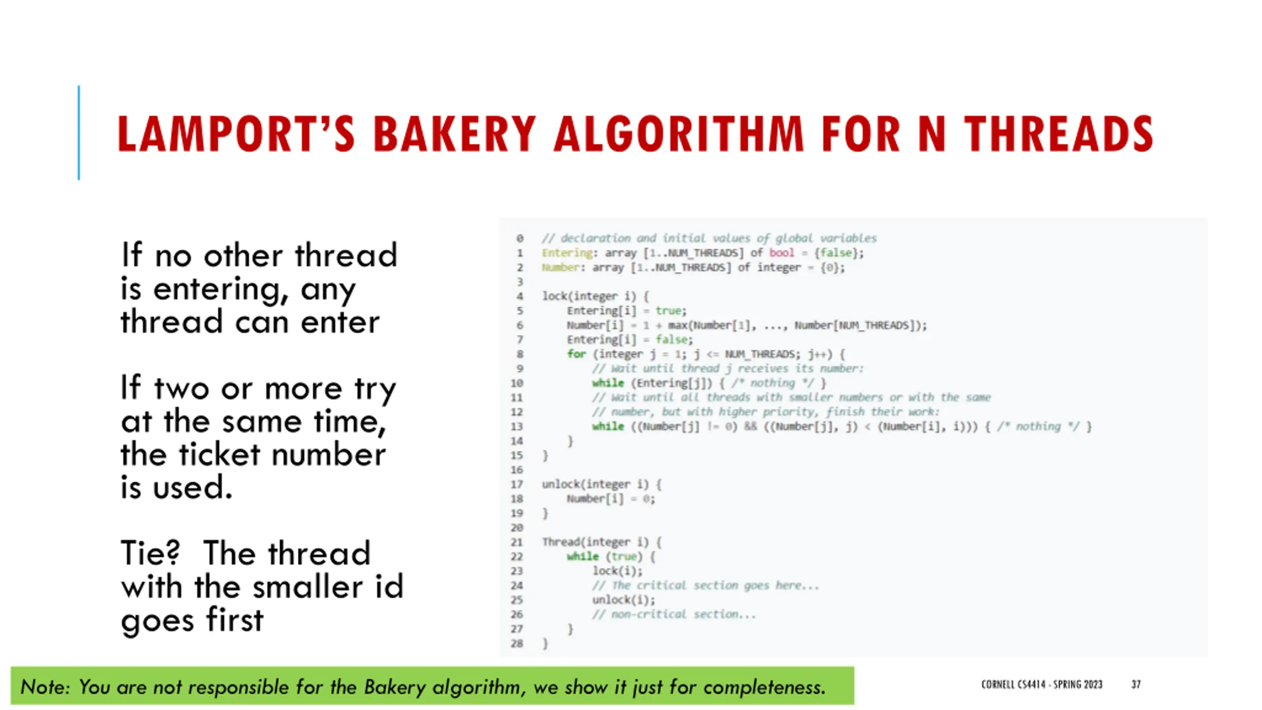 LESLIE LAMPORT Lamport extended Decker s for many threads. He uses a visual story to explain his algorithm: a Bakery with a ticket dispenser Tickets Note: You are not responsible for the Bakery algorithm, we show it just for completeness. CORNELL CS4414 - SPRING 2023 36