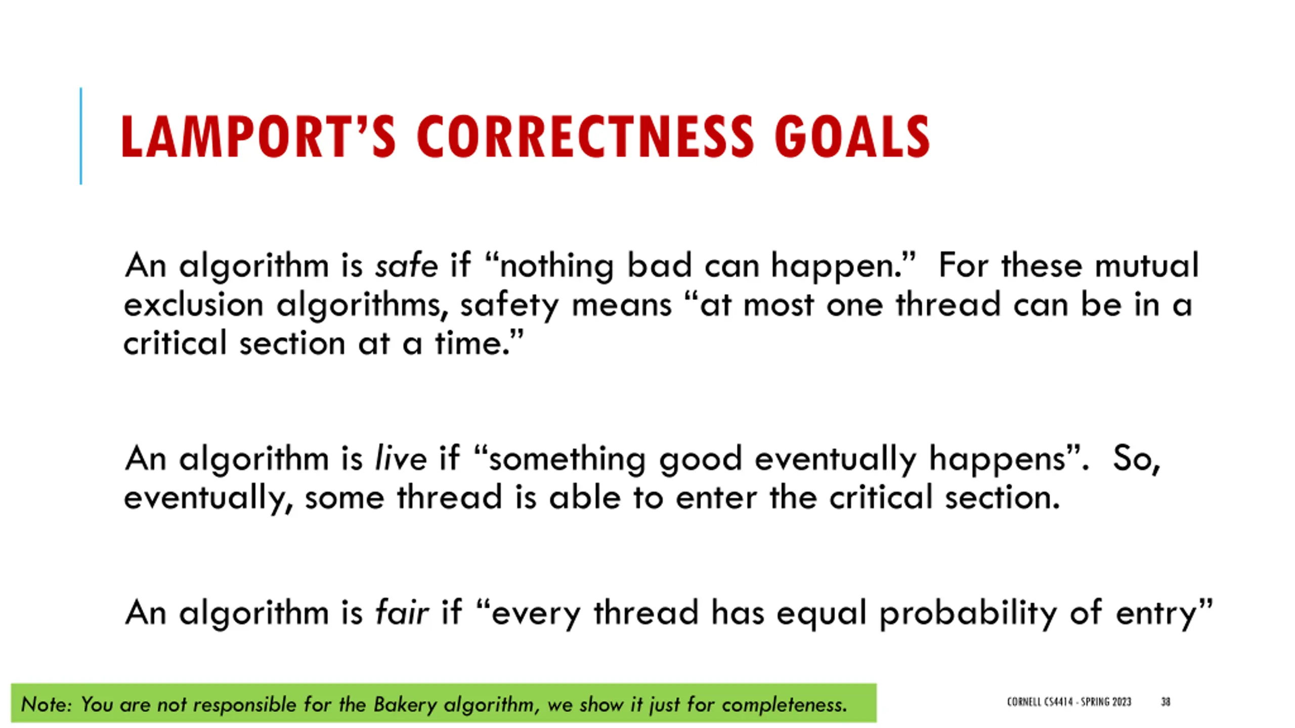 LAMPORTS CORRECTNESS GOALS An algorithm is safeif nothing bad can happen. For these mutual exclusion algorithms, safety means at most one thread can be in a critical section at a time. An algorithm is live if something good eventually happens . So, eventually, some thread is able to enter the critical section. An algorithm is fairif every thread has equal probability of entry Note: You are not responsible for the Bakery algorithm, we show it just for completeness. CORNELL CS4414 - SPRING 2023 38