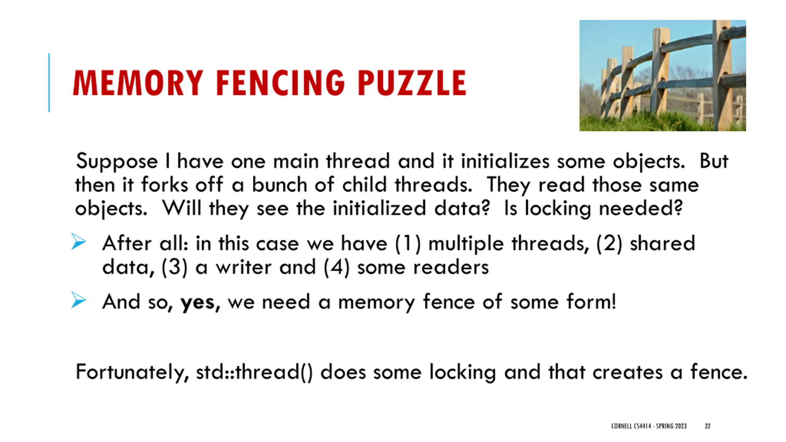 MEMORY FENCING PUZZLE Suppose I have one main thread and it initializes some objects. But then it forks off a bunch of child threads. They read those same objects. Will they see the initialized data? Is locking needed? After all: in this case we have (1) multiple threads, (2) shared data, (3) a writer and (4) some readers And so, yes, we need a memory fence of some form! Fortunately, std::thread() does some locking and that creates a fence. CORNELL CS4414 - SPRING 2023 32