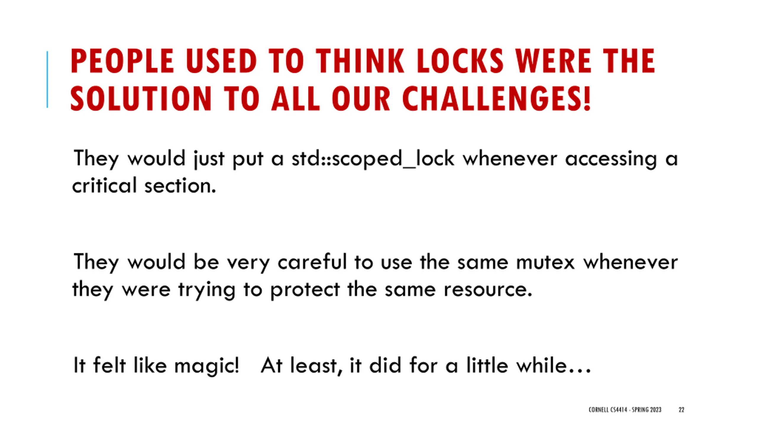 PEOPLE USED TO THINK LOCKS WERE THE SOLUTION TO ALL OUR CHALLENGES! They would just put a std::scoped_lock whenever accessing a critical section. They would be very careful to use the same mutex whenever they were trying to protect the same resource. It felt like magic! At least, it did for a little while CORNELL CS4414 - SPRING 2023 22