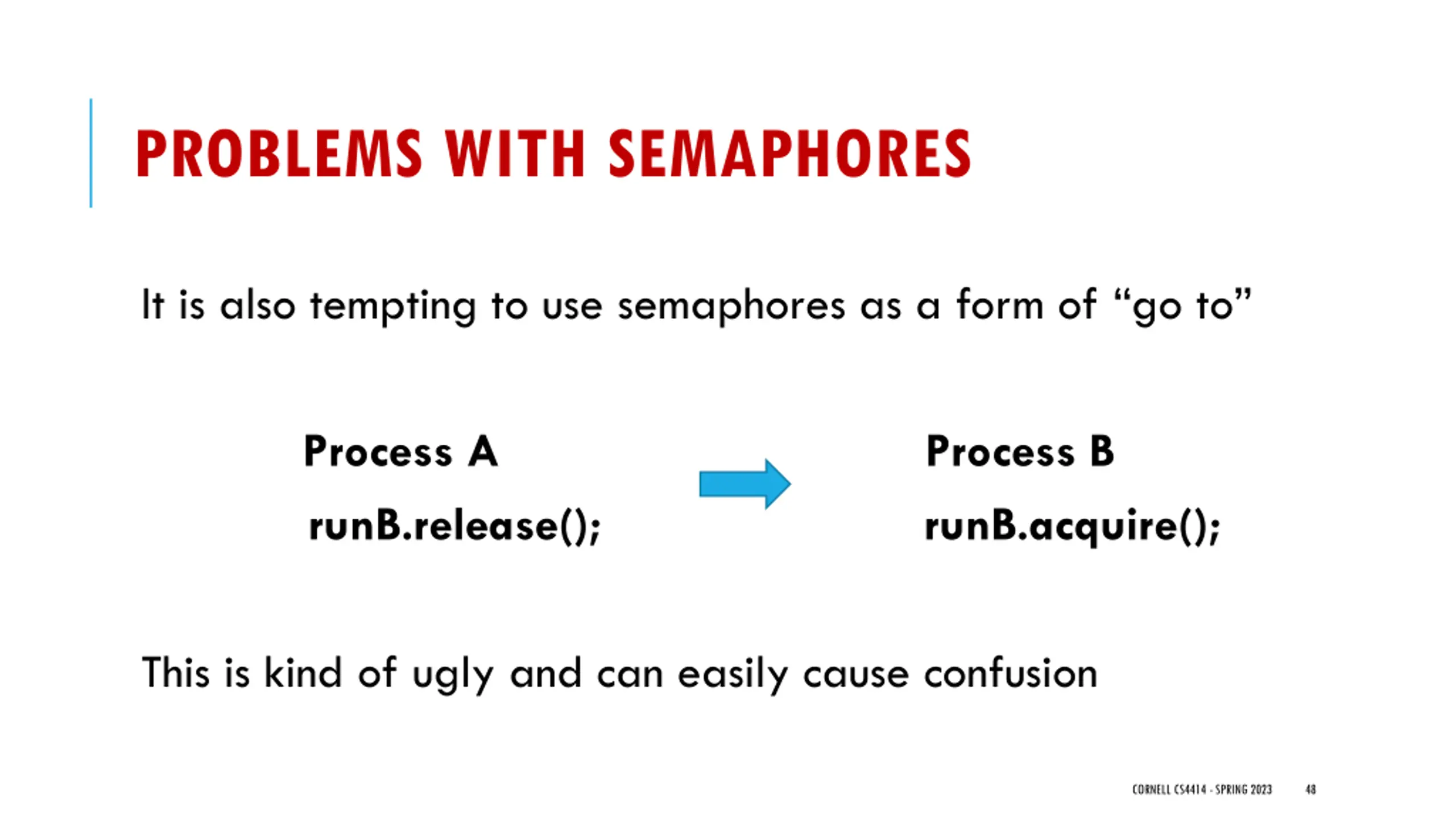 PROBLEMS WITH SEMAPHORES It is also tempting to use semaphores as a form of go to Process A Process B runB.release(); runB.acquire(); This is kind of ugly and can easily cause confusion CORNELL CS4414 - SPRING 2023 48