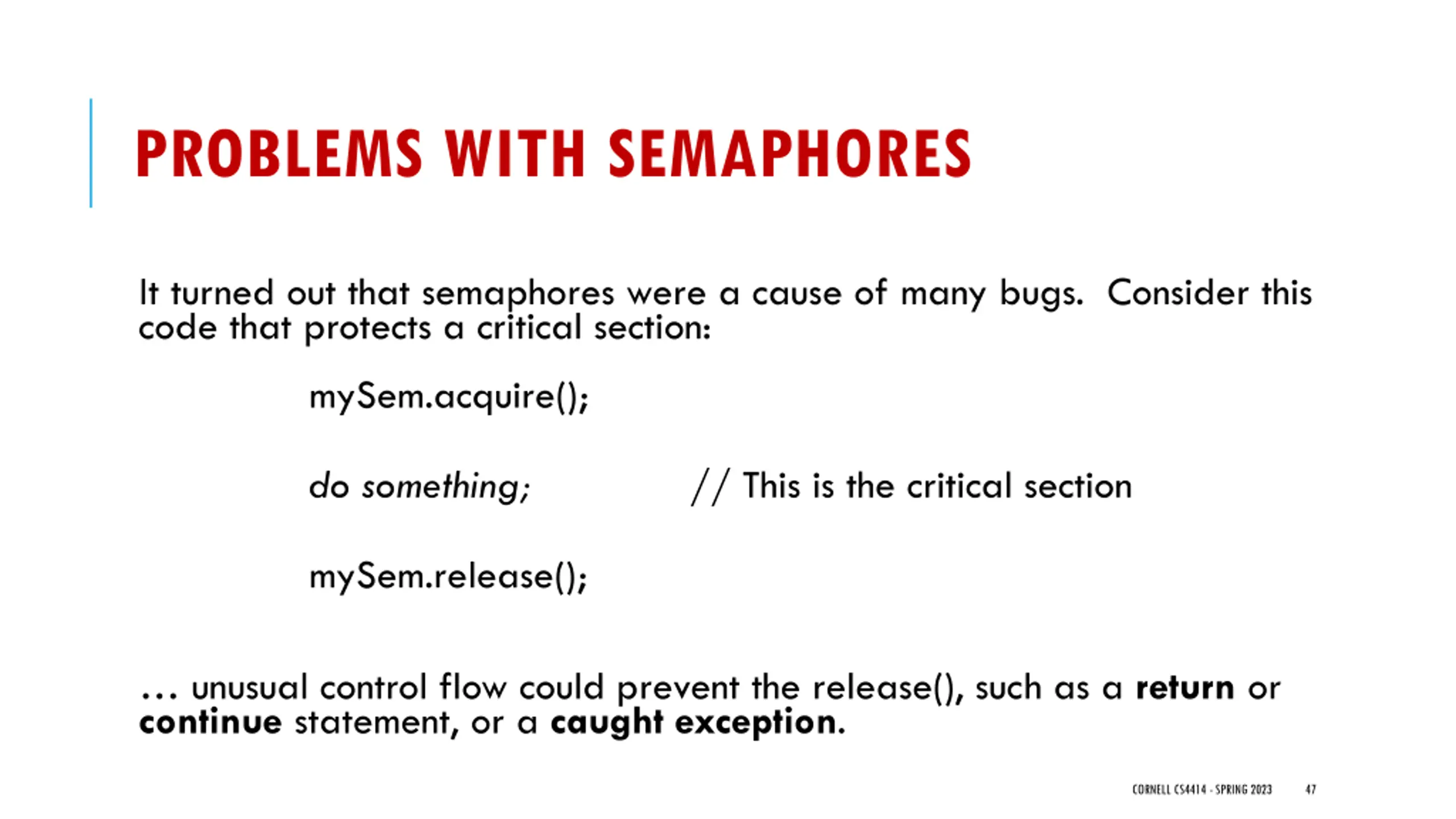PROBLEMS WITH SEMAPHORES It turned out that semaphores were a cause of many bugs. Consider this code that protects a critical section: mySem.acquire(); do something; // This is the critical section mySem.release(); unusual control flow could prevent the release(), such as a return or continue statement, or a caught exception. CORNELL CS4414 - SPRING 2023 47