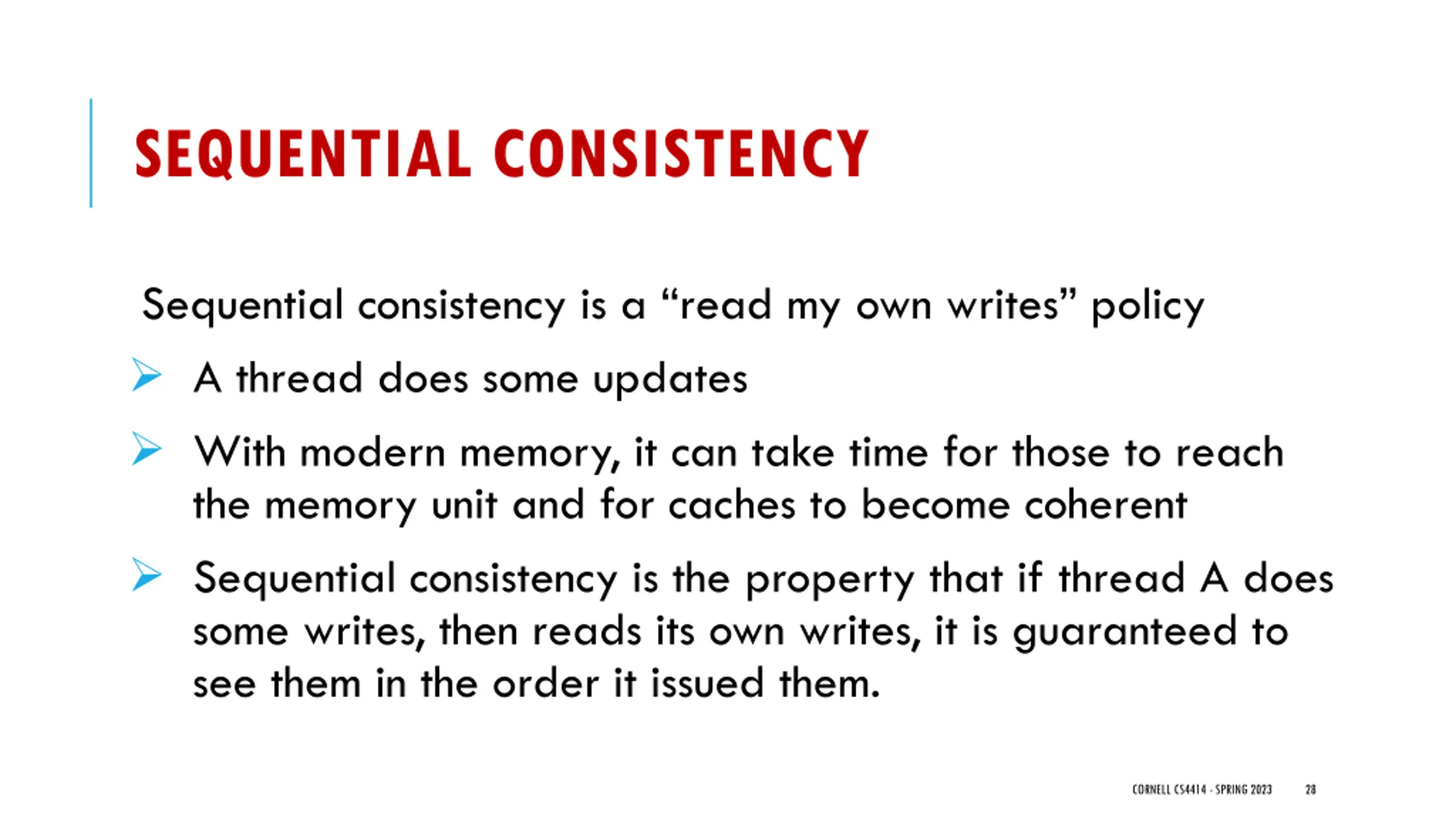 SEQUENTIAL CONSISTENCY Sequential consistency is a read my own writes policy A thread does some updates With modern memory, it can take time for those to reach the memory unit and for caches to become coherent Sequential consistency is the property that if thread A does some writes, then reads its own writes, it is guaranteed to see them in the order it issued them. CORNELL CS4414 - SPRING 2023 28