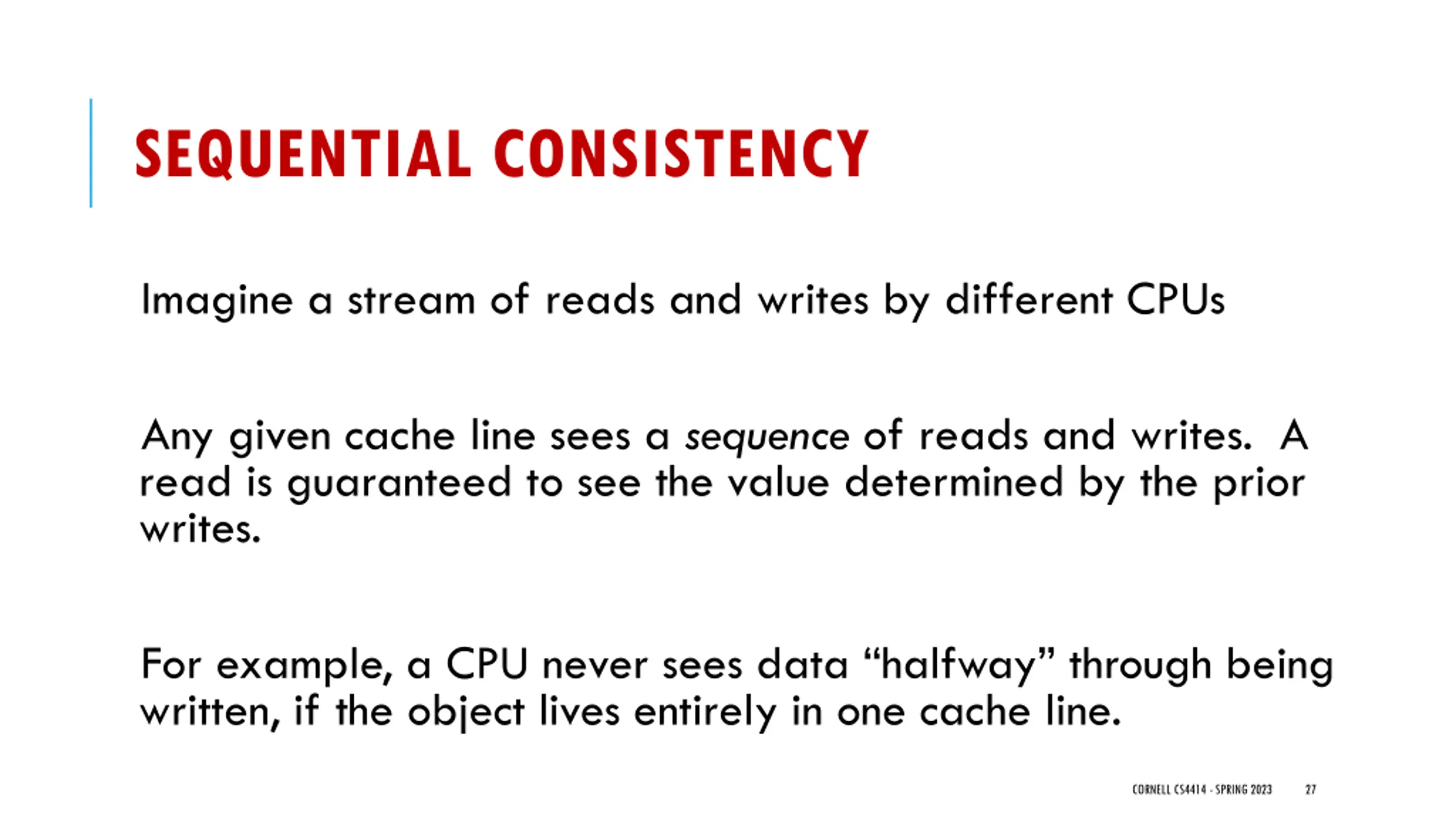 SEQUENTIAL CONSISTENCY Imagine a stream of reads and writes by different CPUs Any given cache line sees a sequence of reads and writes. A read is guaranteed to see the value determined by the prior writes. For example, a CPU never sees data halfway through being written, if the object lives entirely in one cache line. CORNELL CS4414 - SPRING 2023 27