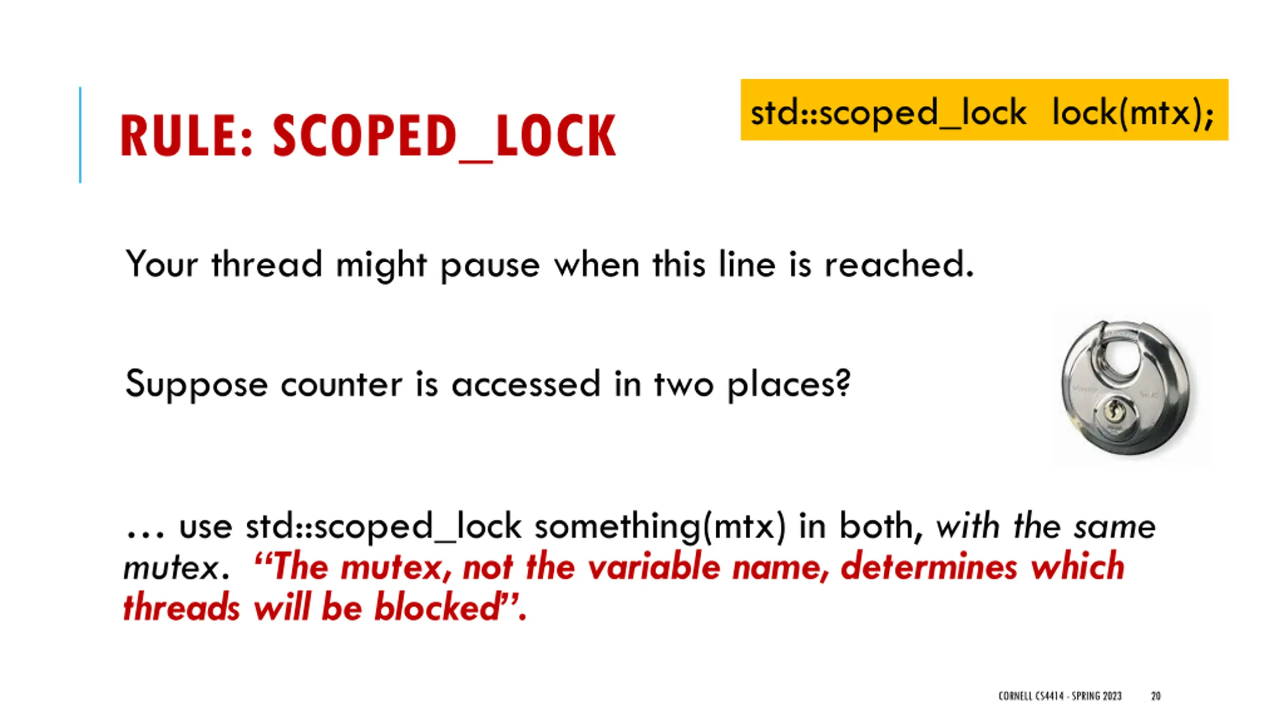 std::scoped_lock lock(mtx); RULE: SCOPED_LOCK Your thread might pause when this line is reached. Suppose counter is accessed in two places? use std::scoped_lock something(mtx) in both, with the same mutex. The mutex, not the variable name, determines which threads will be blocked . CORNELL CS4414 - SPRING 2023 20