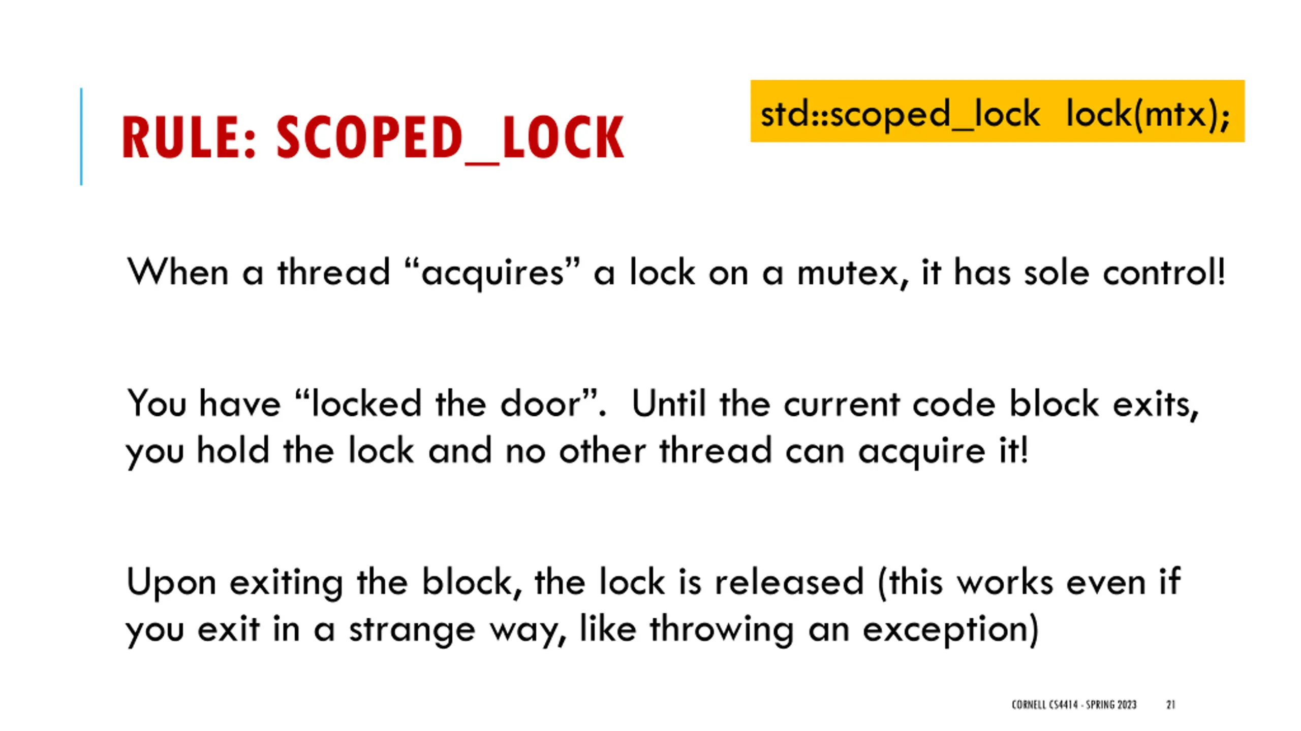 std::scoped_lock lock(mtx); RULE: SCOPED_LOCK When a thread acquires a lock on a mutex, it has sole control! You have locked the door . Until the current code block exits, you hold the lock and no other thread can acquire it! Upon exiting the block, the lock is released (this works even if you exit in a strange way, like throwing an exception) CORNELL CS4414 - SPRING 2023 21