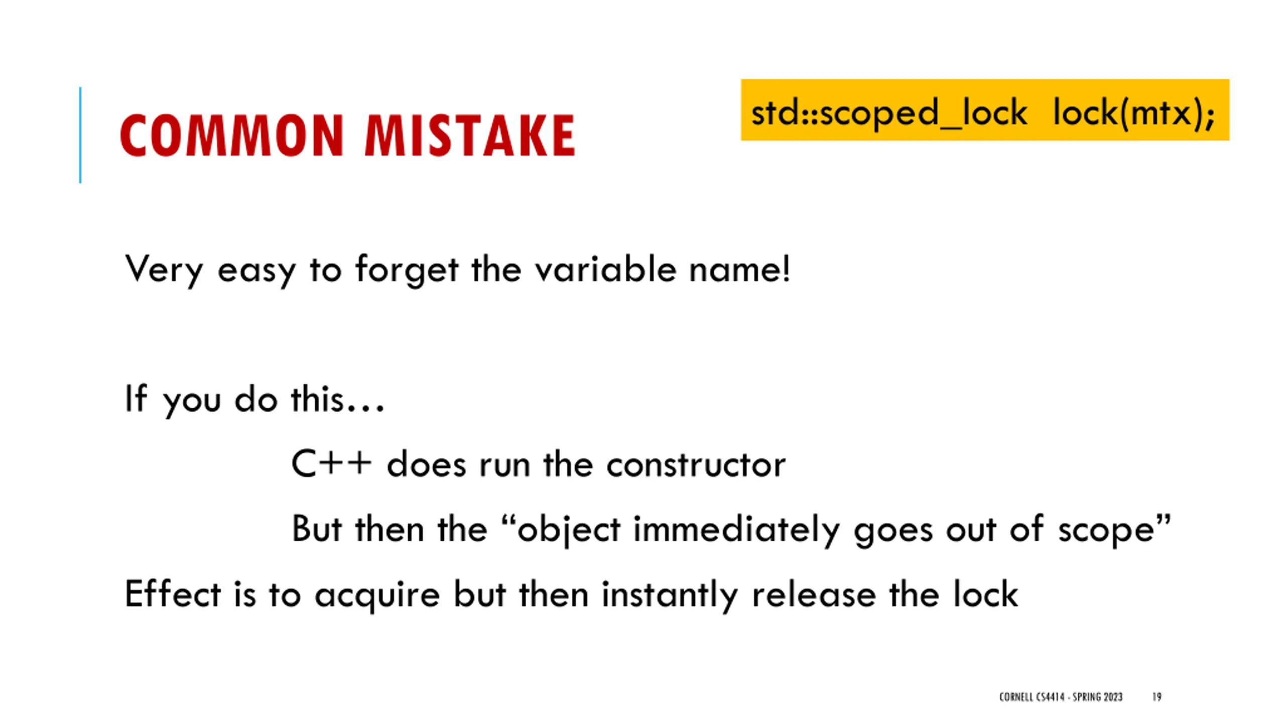 std::scoped_lock(mtx); std::scoped_lock lock(mtx); COMMON MISTAKE Very easy to forget the variable name! If you do this C++ does run the constructor But then the object immediately goes out of scope Effect is to acquire but then instantly release the lock CORNELL CS4414 - SPRING 2023 19