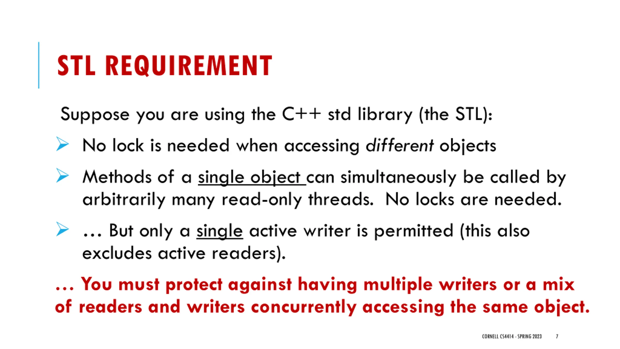 STL REQUIREMENT Suppose you are using the C++ std library (the STL): No lock is needed when accessing different objects Methods of a single object can simultaneously be called by arbitrarily many read-only threads. No locks are needed. But only a single active writer is permitted (this also excludes active readers). You must protect against having multiple writers or a mix of readers and writers concurrently accessing the same object. CORNELL CS4414 - SPRING 2023 7
