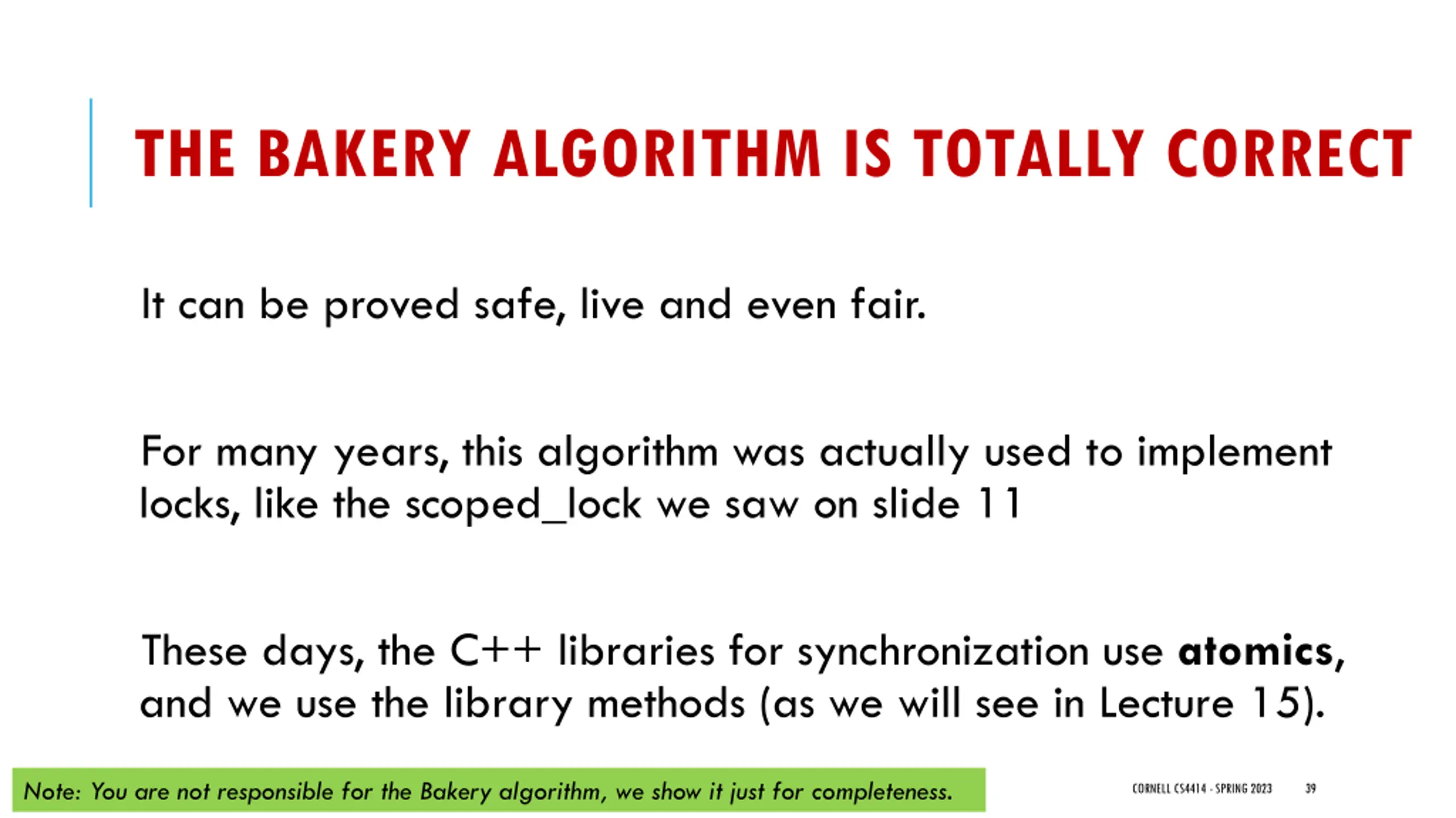 THE BAKERY ALGORITHM IS TOTALLY CORRECT It can be proved safe, live and even fair. For many years, this algorithm was actually used to implement locks, like the scoped_lock we saw on slide 11 These days, the C++ libraries for synchronization use atomics, and we use the library methods (as we will see in Lecture 15). Note: You are not responsible for the Bakery algorithm, we show it just for completeness. CORNELL CS4414 - SPRING 2023 39