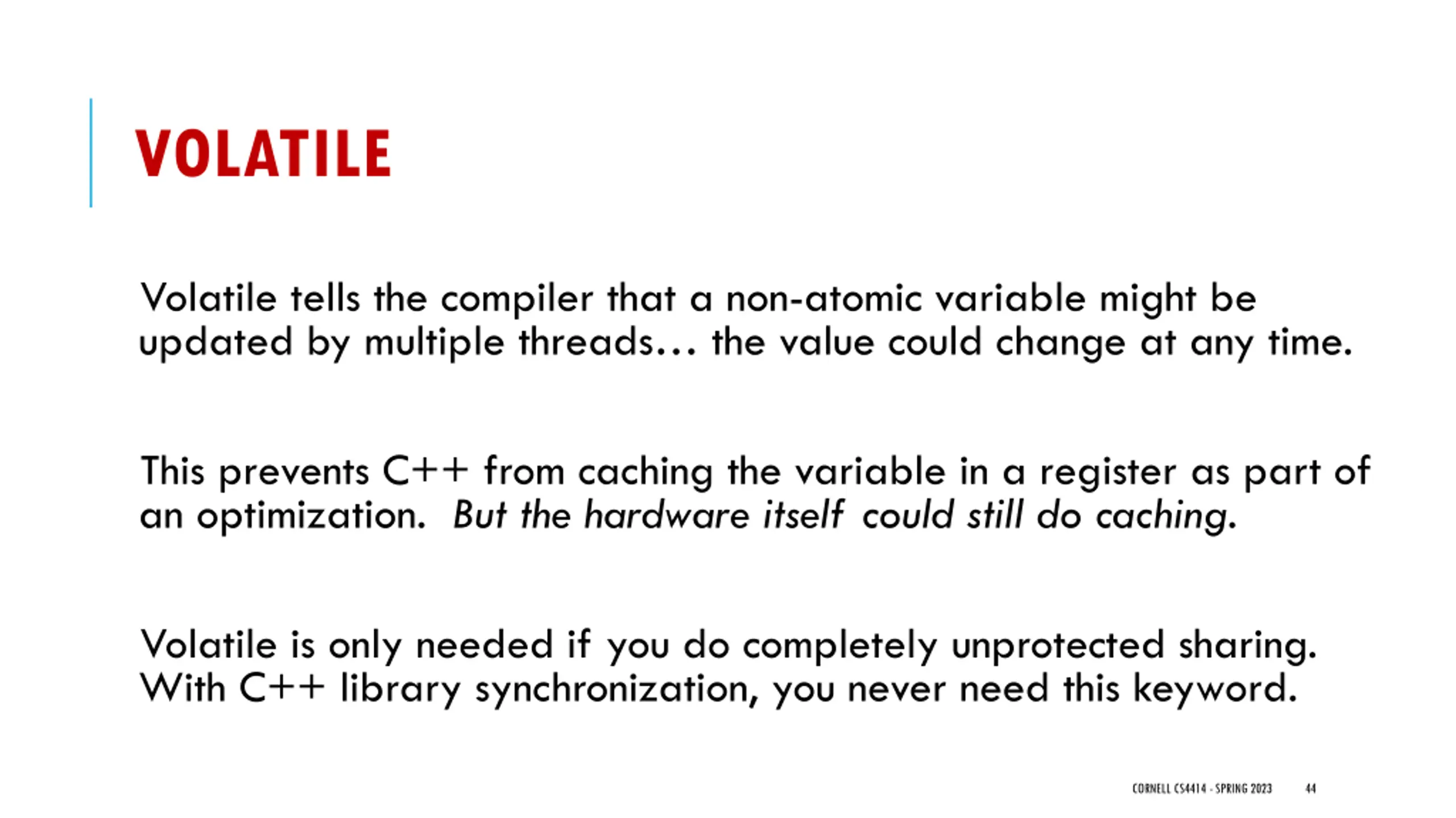 VOLATILE Volatile tells the compiler that a non-atomic variable might be updated by multiple threads the value could change at any time. This prevents C++ from caching the variable in a register as part of an optimization. But the hardware itself could still do caching. Volatile is only needed if you do completely unprotected sharing. With C++ library synchronization, you never need this keyword. CORNELL CS4414 - SPRING 2023 44
