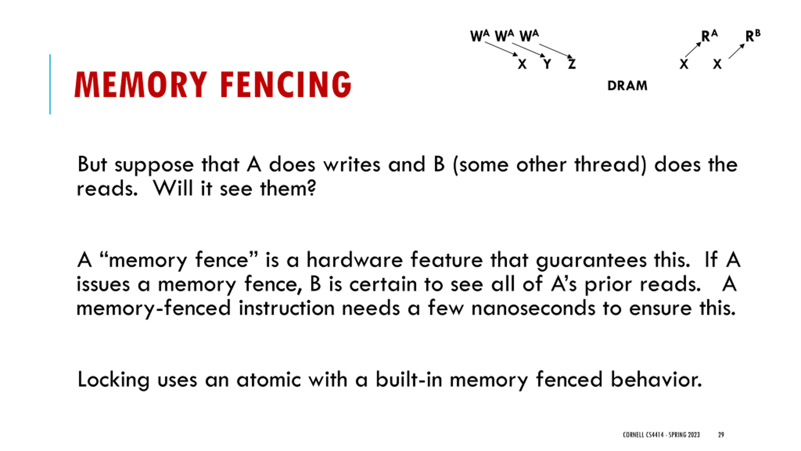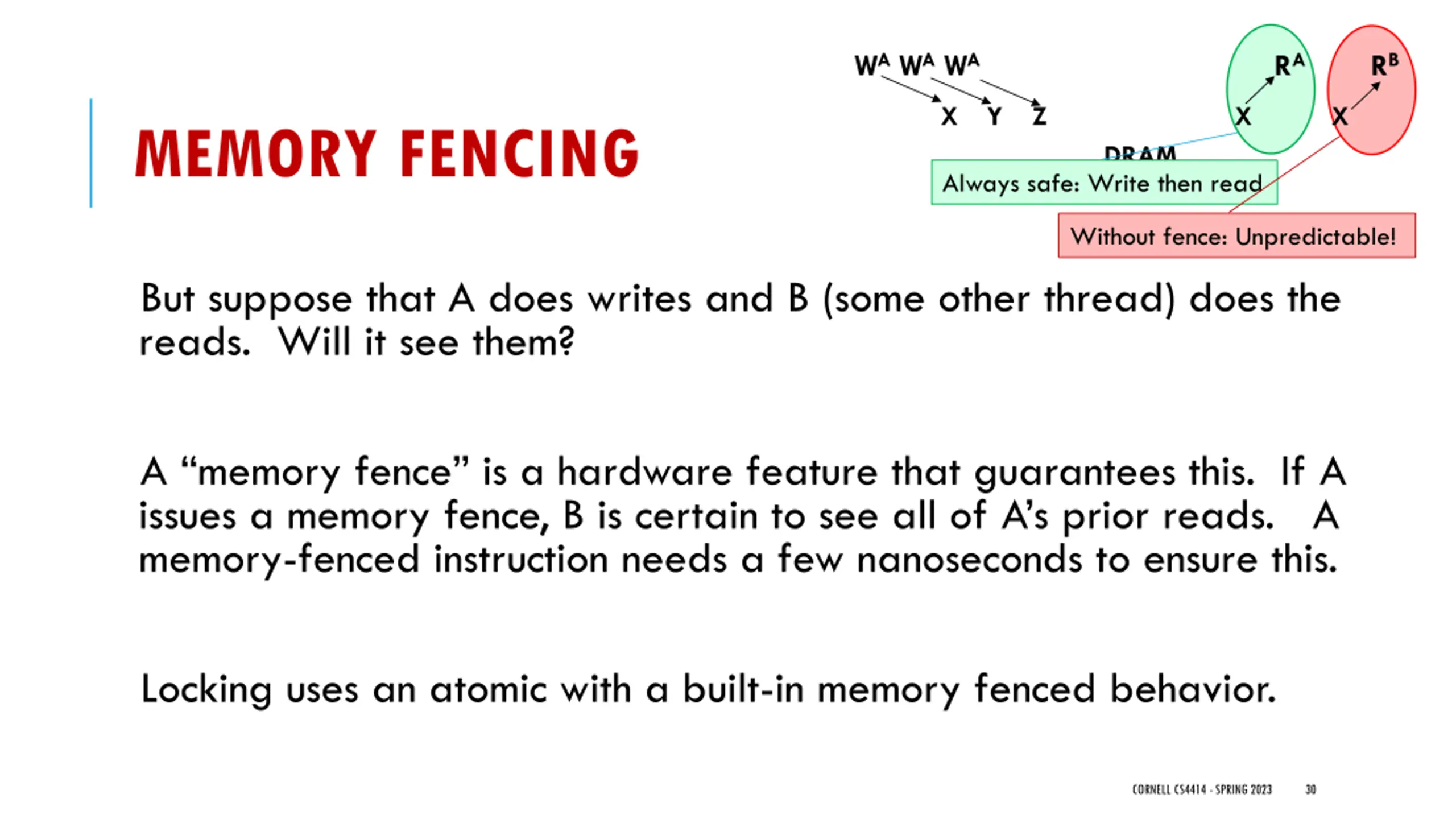 WA WA WA RA RB X Y Z X X DRAM MEMORY FENCING But suppose that A does writes and B (some other thread) does the reads. Will it see them? A memory fence is a hardware feature that guarantees this. If A issues a memory fence, B is certain to see all of A s prior reads. A memory-fenced instruction needs a few nanoseconds to ensure this. Locking uses an atomic with a built-in memory fenced behavior. CORNELL CS4414 - SPRING 2023 29