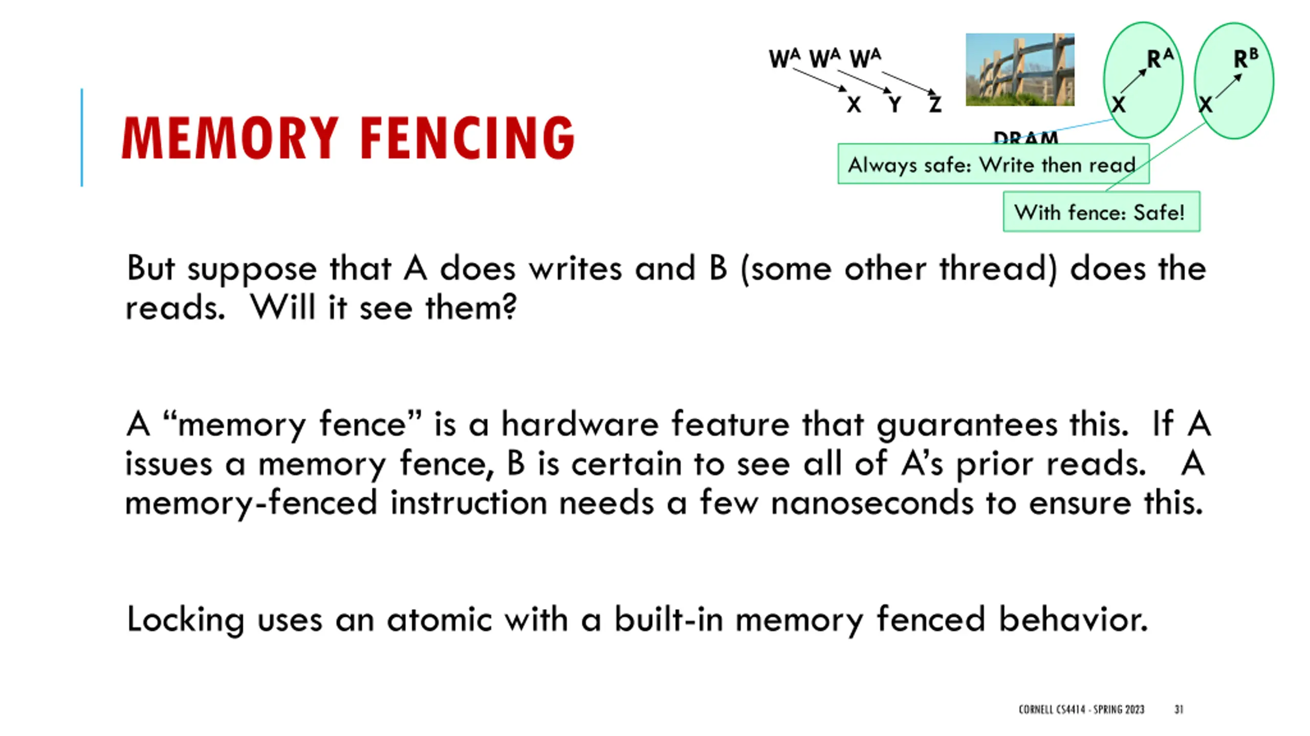 WA WA WA RA RB X Y Z X X DRAM Always safe: Write then read MEMORY FENCING Without fence: Unpredictable! But suppose that A does writes and B (some other thread) does the reads. Will it see them? A memory fence is a hardware feature that guarantees this. If A issues a memory fence, B is certain to see all of A s prior reads. A memory-fenced instruction needs a few nanoseconds to ensure this. Locking uses an atomic with a built-in memory fenced behavior. CORNELL CS4414 - SPRING 2023 30