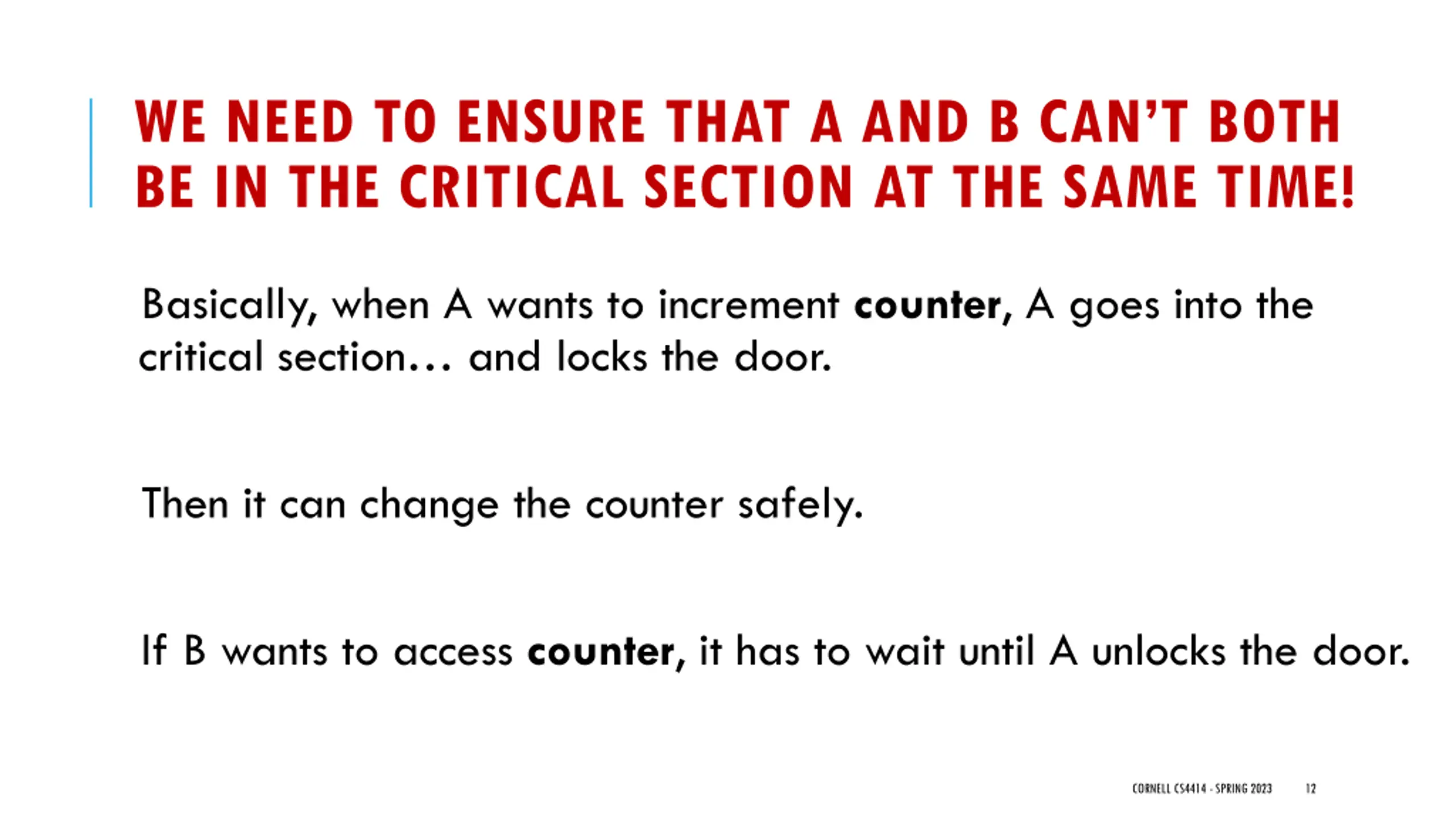WE NEED TO ENSURE THAT A AND B CANT BOTH BE IN THE CRITICAL SECTION AT THE SAME TIME! Basically, when A wants to increment counter, A goes into the critical section and locks the door. Then it can change the counter safely. If B wants to access counter, it has to wait until A unlocks the door. CORNELL CS4414 - SPRING 2023 12