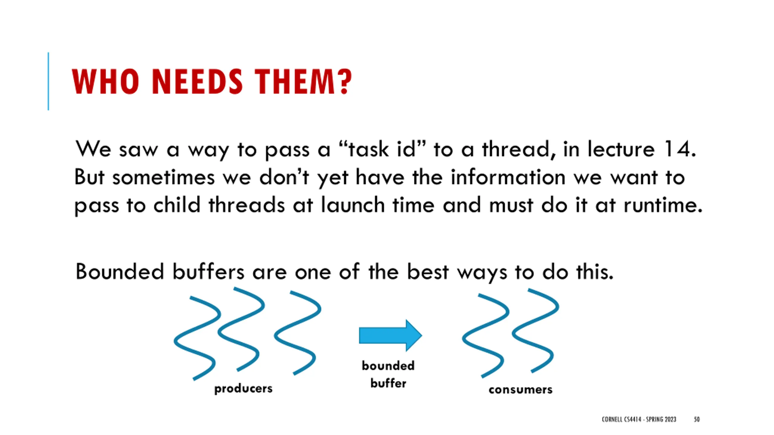 WHO NEEDS THEM? We saw a way to pass a task id to a thread, in lecture 14. But sometimes we don t yet have the information we want to pass to child threads at launch time and must do it at runtime. Bounded buffers are one of the best ways to do this. bounded buffer producers consumers CORNELL CS4414 - SPRING 2023 50