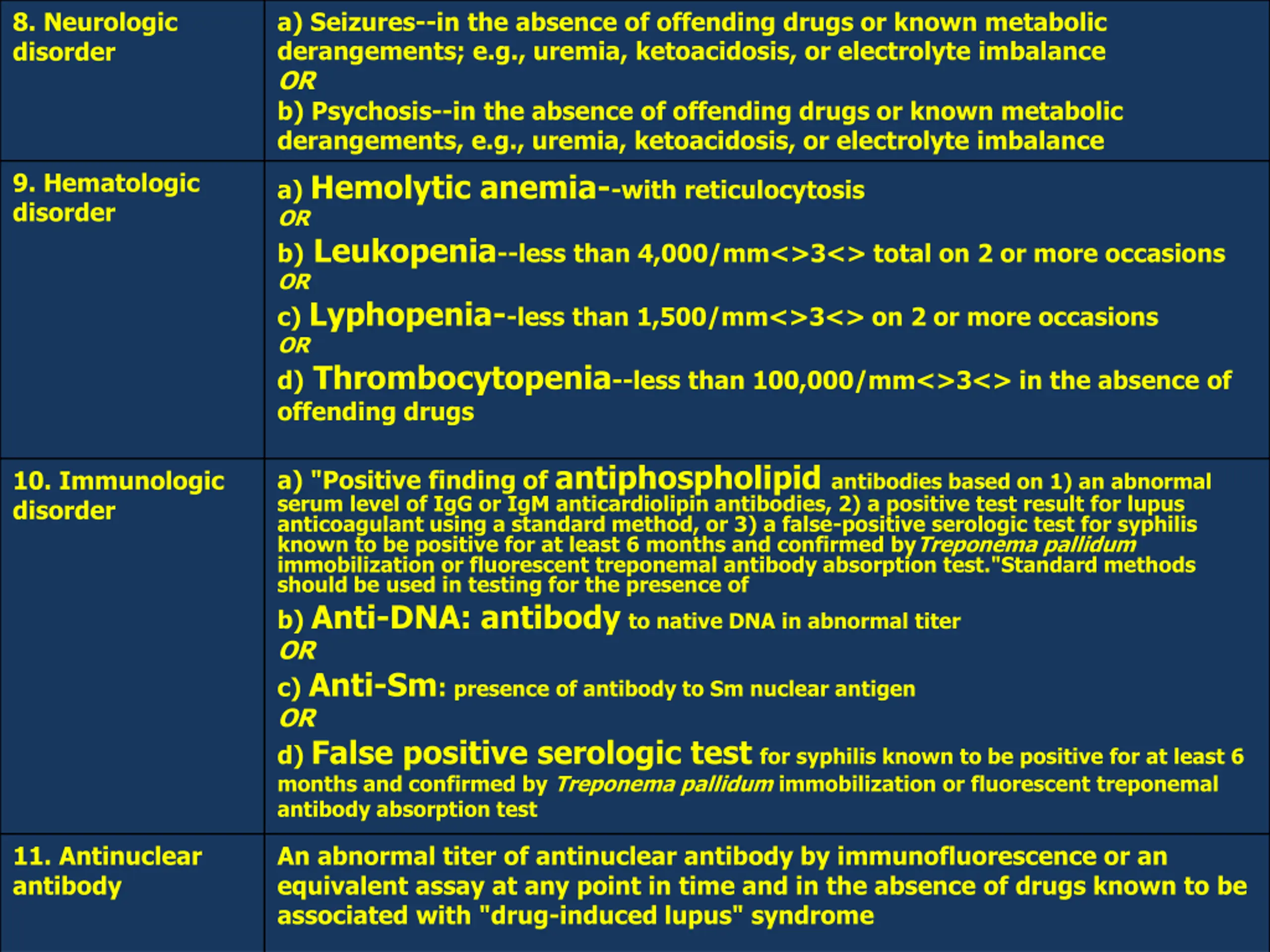 8. Neurologic disorder a) Seizures--in the absence of offending drugs or known metabolic derangements; e.g., uremia, ketoacidosis, or electrolyte imbalance OR b) Psychosis--in the absence of offending drugs or known metabolic derangements, e.g., uremia, ketoacidosis, or electrolyte imbalance 9. Hematologic disorder a) Hemolytic anemia--with reticulocytosis OR b) Leukopenia--less than 4,000/mm<>3<> total on 2 or more occasions OR c) Lyphopenia--less than 1,500/mm<>3<> on 2 or more occasions OR d) Thrombocytopenia--less than 100,000/mm<>3<> in the absence of offending drugs a) "Positive finding of antiphospholipid antibodies based on 1) an abnormal serum level of IgG or IgM anticardiolipin antibodies, 2) a positive test result for lupus anticoagulant using a standard method, or 3) a false-positive serologic test for syphilis known to be positive for at least 6 months and confirmed byTreponema pallidum immobilization or fluorescent treponemal antibody absorption test."Standard methods should be used in testing for the presence of b) Anti-DNA: antibodyto native DNA in abnormal titer OR c) Anti-Sm: presence of antibody to Sm nuclear antigen OR d) False positive serologic testfor syphilis known to be positive for at least 6 months and confirmed by Treponema pallidum immobilization or fluorescent treponemal antibody absorption test 10. Immunologic disorder 11. Antinuclear antibody An abnormal titer of antinuclear antibody by immunofluorescence or an equivalent assay at any point in time and in the absence of drugs known to be associated with "drug-induced lupus" syndrome