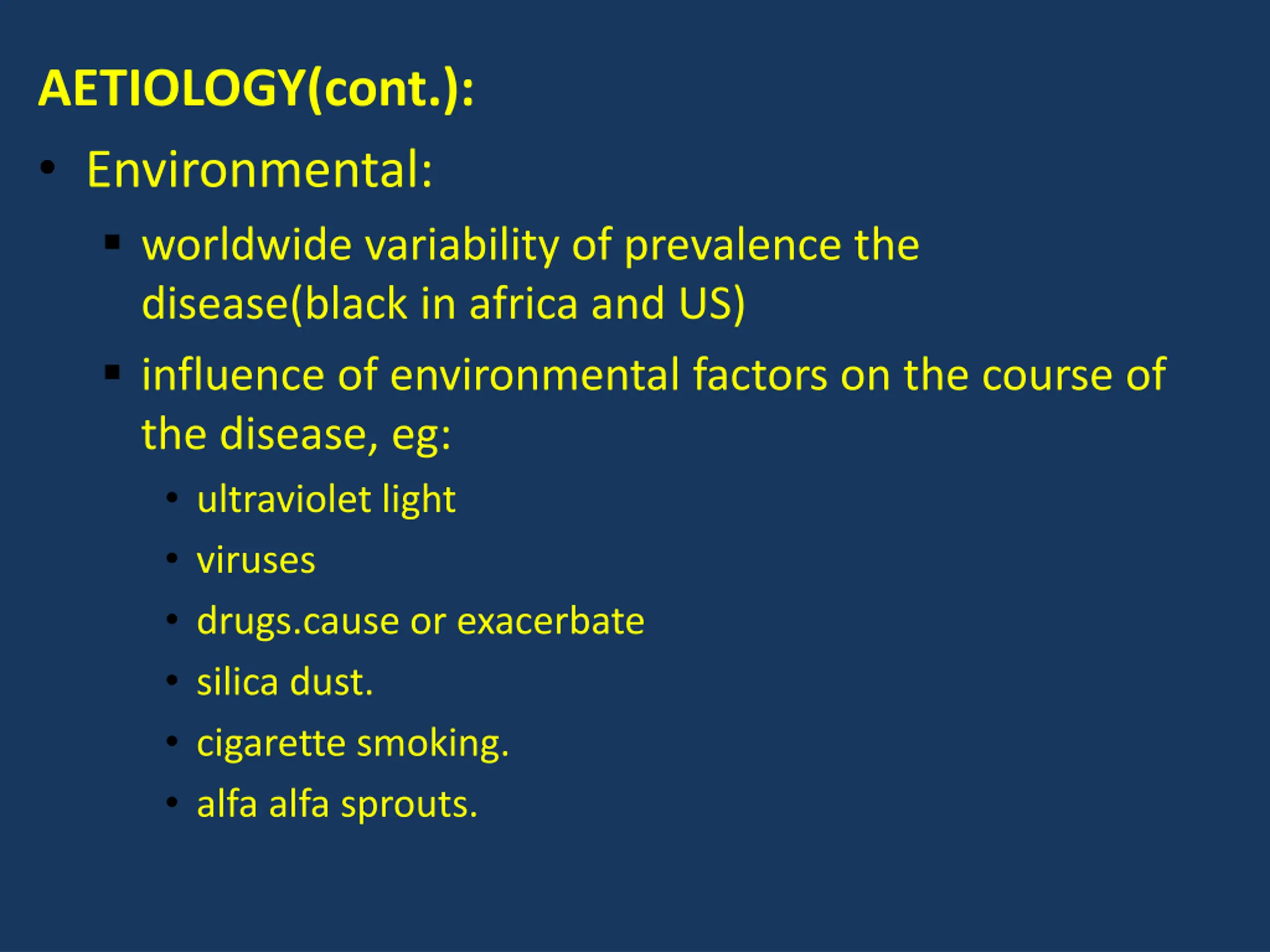 AETIOLOGY(cont.): Environmental: worldwide variability of prevalence the disease(black in africa and US) influence of environmental factors on the course of the disease, eg: ultraviolet light viruses drugs.cause or exacerbate silica dust. cigarette smoking. alfa alfa sprouts.