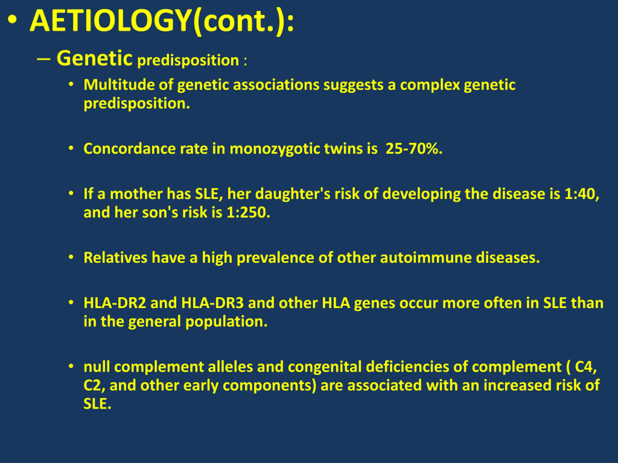 AETIOLOGY(cont.): Genetic predisposition : Multitude of genetic associations suggests a complex genetic predisposition. Concordance rate in monozygotic twins is 25-70%. If a mother has SLE, her daughter's risk of developing the disease is 1:40, and her son's risk is 1:250. Relatives have a high prevalence of other autoimmune diseases. HLA-DR2 and HLA-DR3 and other HLA genes occur more often in SLE than in the general population. null complement alleles and congenital deficiencies of complement ( C4, C2, and other early components) are associated with an increased risk of SLE.