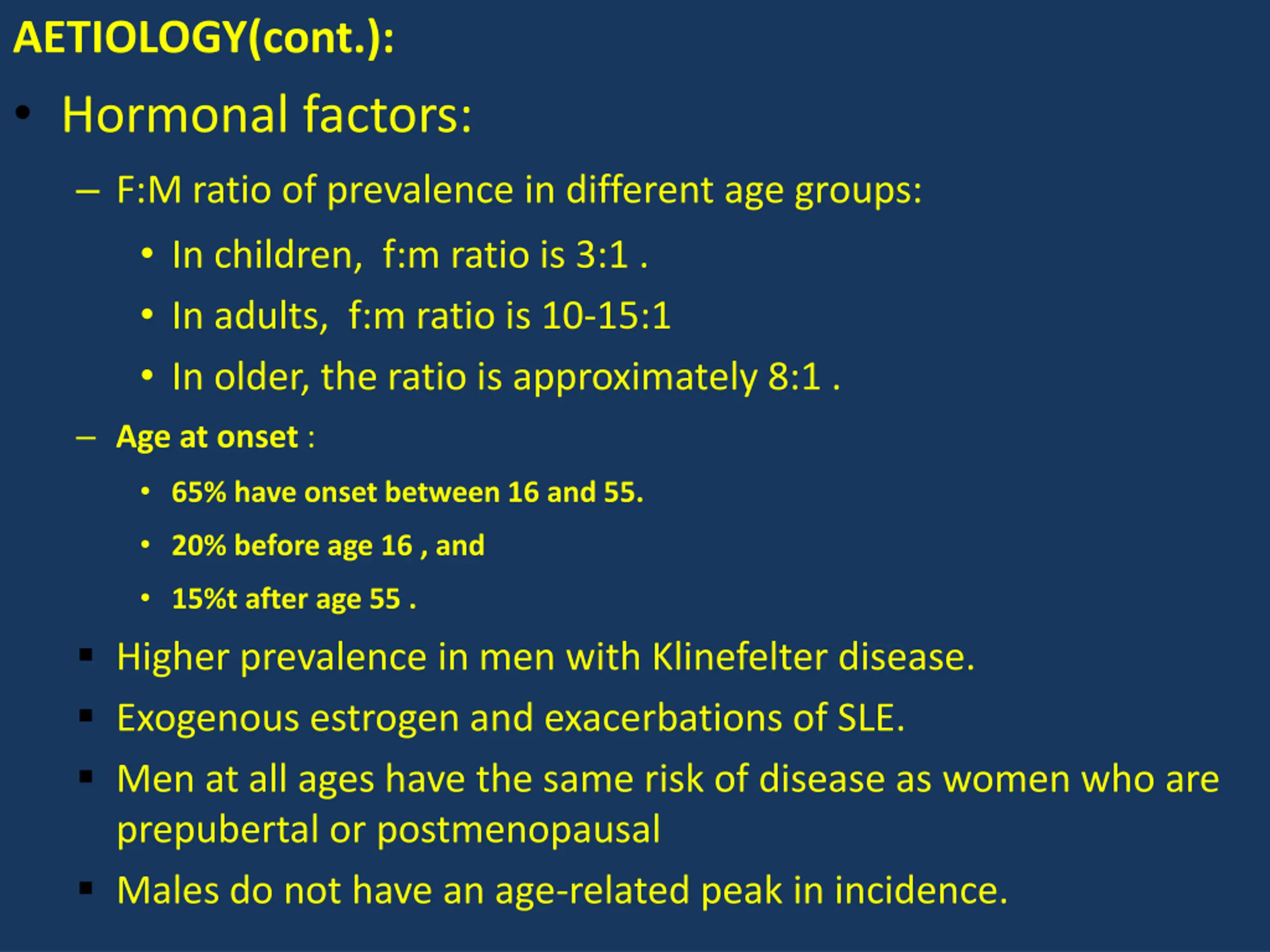 AETIOLOGY(cont.): Hormonal factors: F:M ratio of prevalence in different age groups: In children, f:m ratio is 3:1 . In adults, f:m ratio is 10-15:1 In older, the ratio is approximately 8:1 . Age at onset : 65% have onset between 16 and 55. 20% before age 16 , and 15%t after age 55 . Higher prevalence in men with Klinefelter disease. Exogenous estrogen and exacerbations of SLE. Men at all ages have the same risk of disease as women who are prepubertal or postmenopausal Males do not have an age-related peak in incidence.