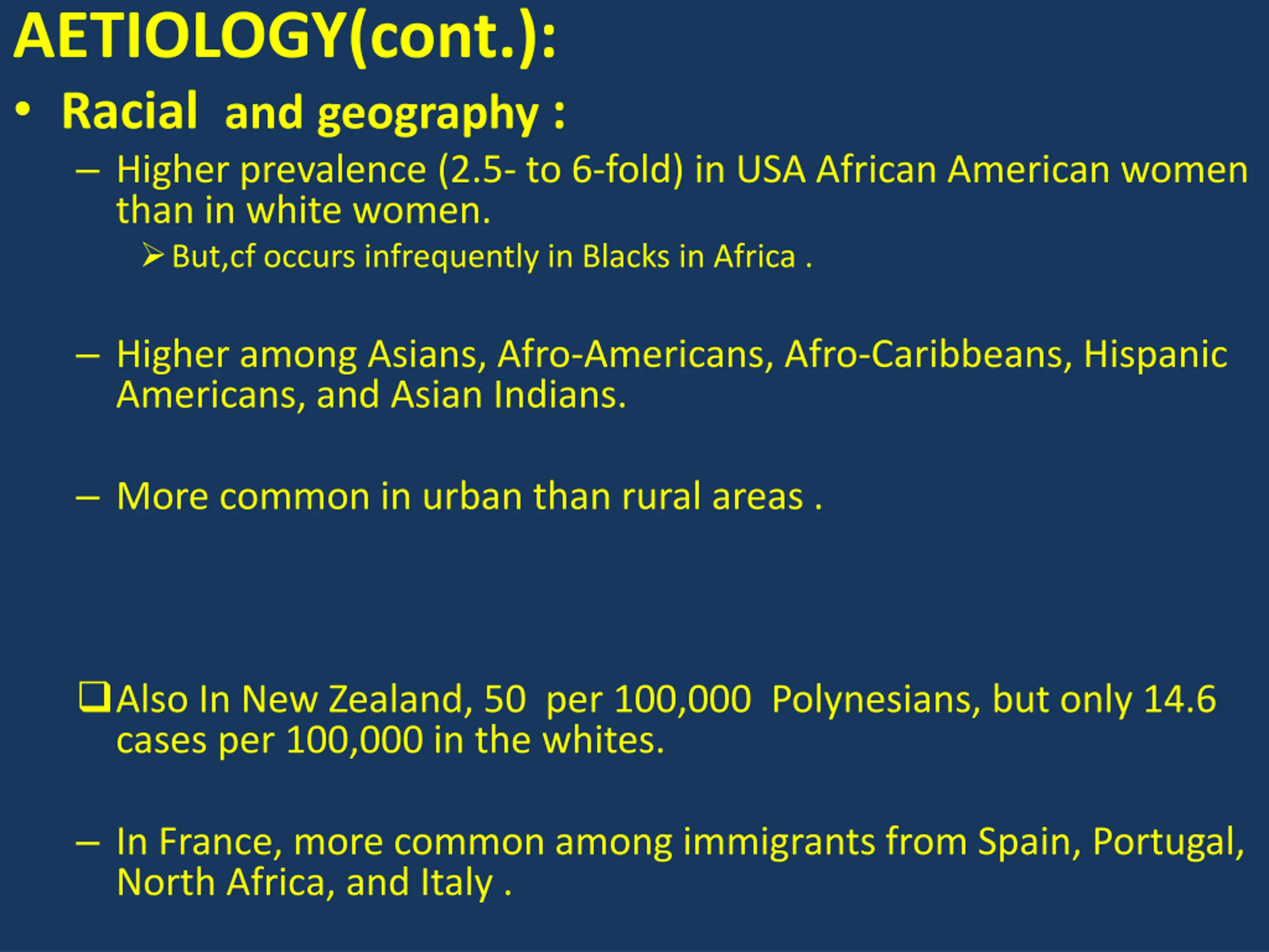 AETIOLOGY(cont.): Racial andgeography : Higher prevalence (2.5- to 6-fold) in USA African American women than in white women. But,cf occurs infrequently in Blacks in Africa . Higher among Asians, Afro-Americans, Afro-Caribbeans, Hispanic Americans, and Asian Indians. More common in urban than rural areas . Also In New Zealand, 50 per 100,000 Polynesians, but only 14.6 cases per 100,000 in the whites. In France, more common among immigrants from Spain, Portugal, North Africa, and Italy .