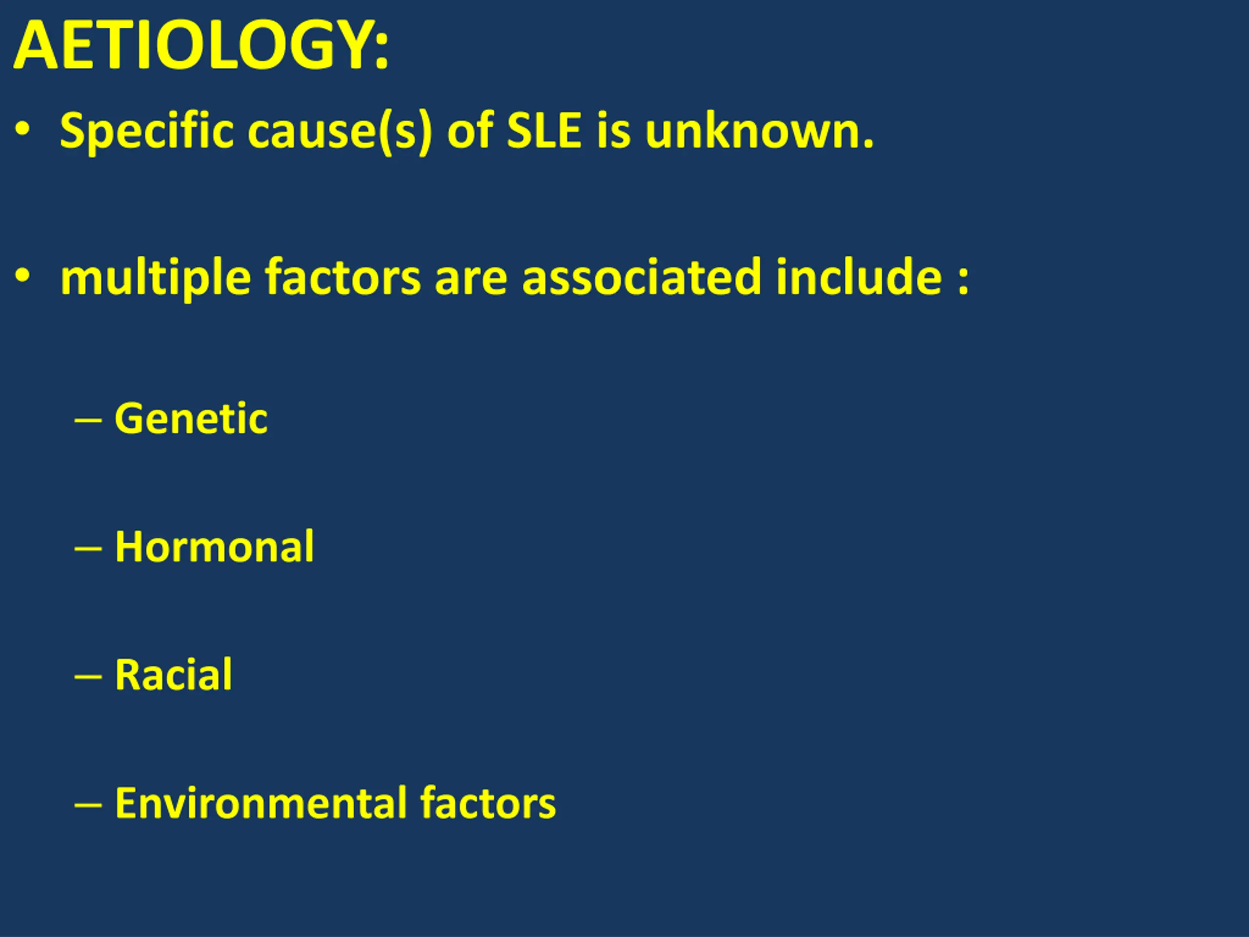 AETIOLOGY: Specific cause(s) of SLE is unknown. multiple factors are associated include : Genetic Hormonal Racial Environmental factors