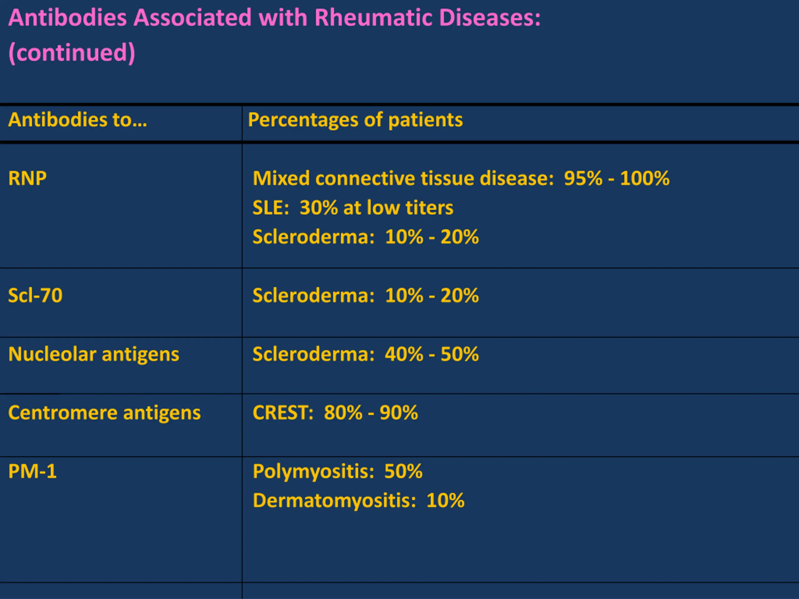Antibodies Associated with Rheumatic Diseases: (continued) Antibodies to Percentages of patients RNP Mixed connective tissue disease: 95% - 100% SLE: 30% at low titers Scleroderma: 10% - 20% Scl-70 Scleroderma: 10% - 20% Nucleolar antigens Scleroderma: 40% - 50% Centromere antigens CREST: 80% - 90% PM-1 Polymyositis: 50% Dermatomyositis: 10%