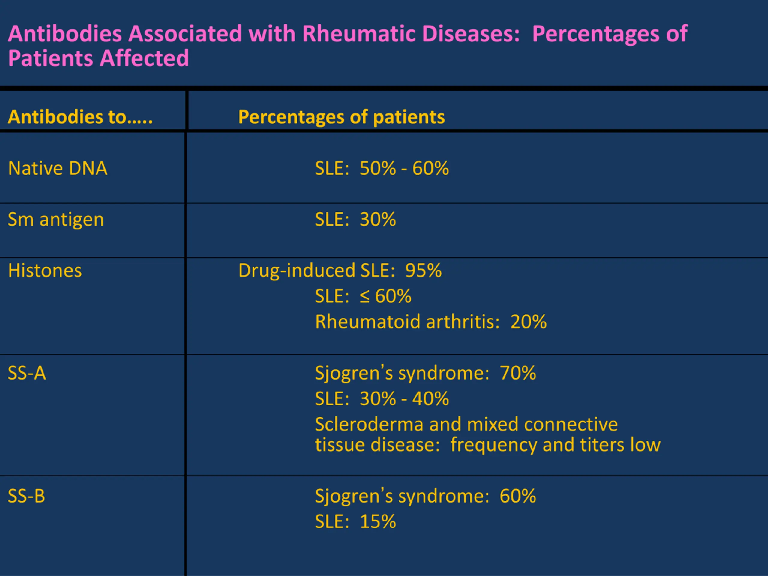 Antibodies Associated with Rheumatic Diseases: Percentages of Patients Affected Antibodies to .. Percentages of patients Native DNA SLE: 50% - 60% Sm antigen SLE: 30% Histones Drug-induced SLE: 95% SLE: 60% Rheumatoid arthritis: 20% Sjogren s syndrome: 70% SLE: 30% - 40% Scleroderma and mixed connective tissue disease: frequency and titers low SS-A Sjogren s syndrome: 60% SLE: 15% SS-B