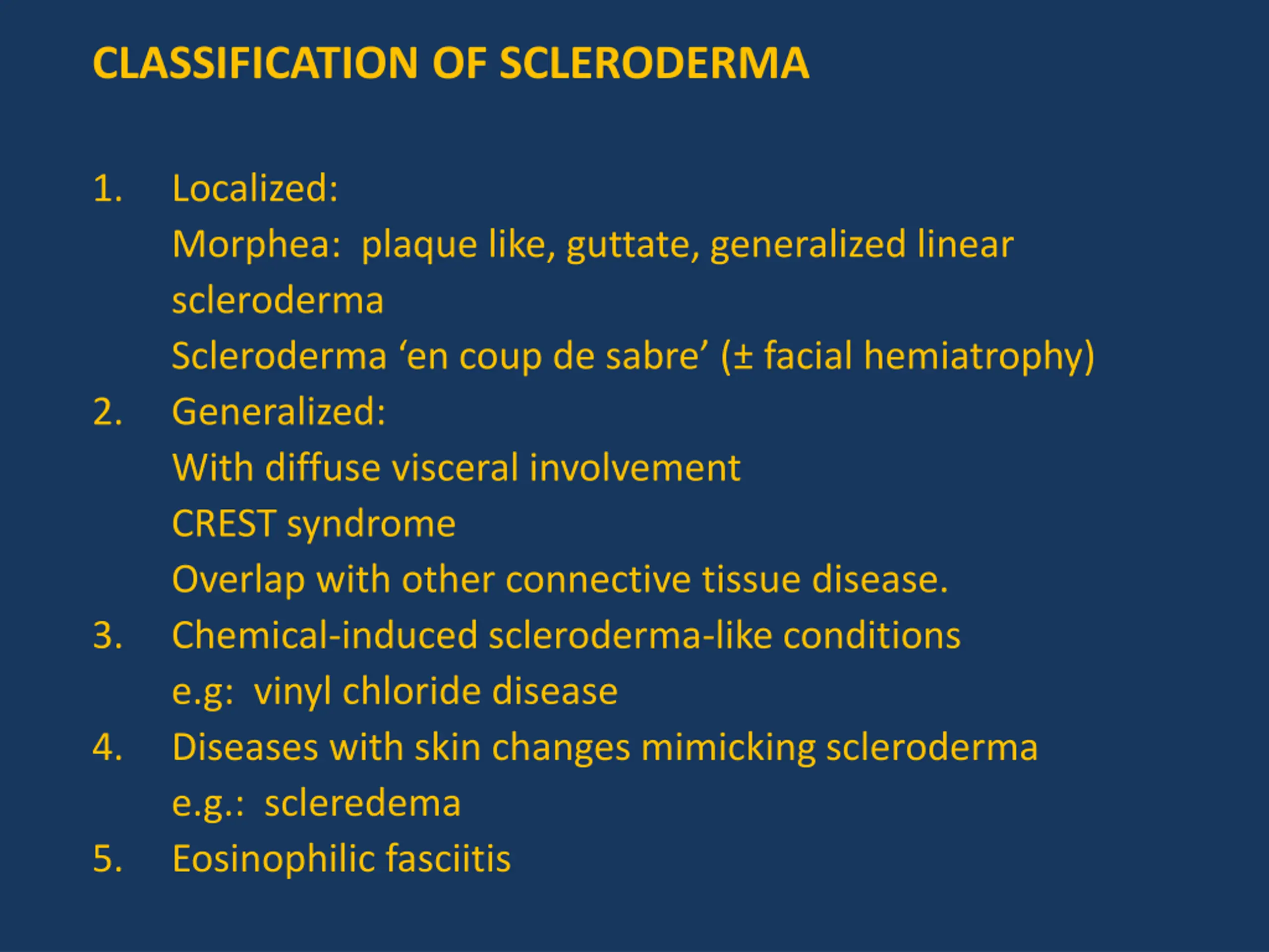 CLASSIFICATION OF SCLERODERMA 1. Localized: Morphea: plaque like, guttate, generalized linear scleroderma Scleroderma en coup de sabre ( facial hemiatrophy) 2. Generalized: With diffuse visceral involvement CREST syndrome Overlap with other connective tissue disease. 3. Chemical-induced scleroderma-like conditions e.g: vinyl chloride disease 4. Diseases with skin changes mimicking scleroderma e.g.: scleredema 5. Eosinophilic fasciitis