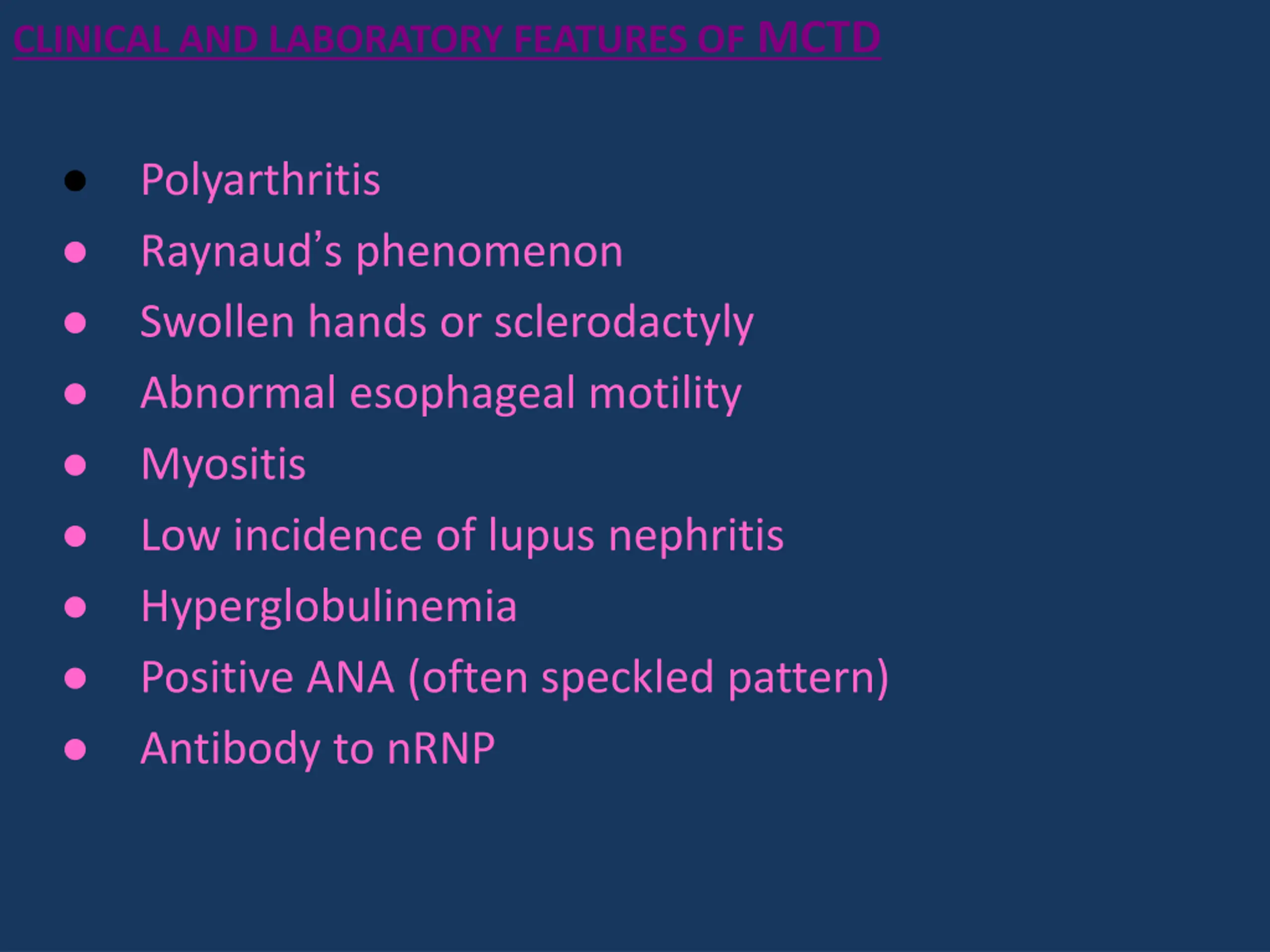 CLINICAL AND LABORATORY FEATURES OF MCTD Polyarthritis Raynaud s phenomenon Swollen hands or sclerodactyly Abnormal esophageal motility Myositis Low incidence of lupus nephritis Hyperglobulinemia Positive ANA (often speckled pattern) Antibody to nRNP